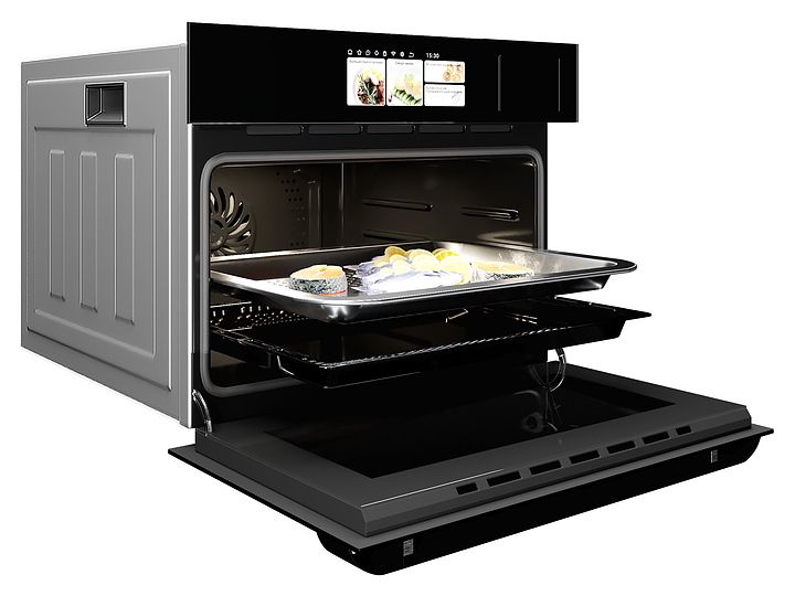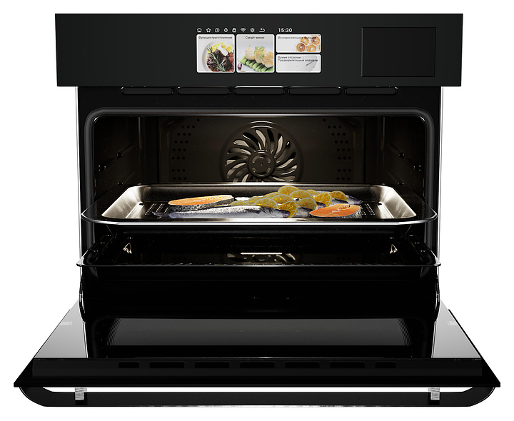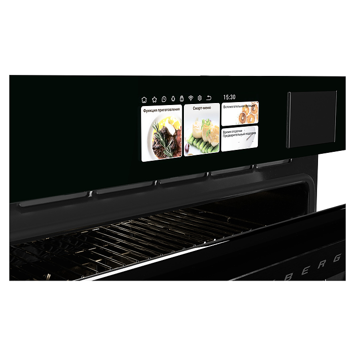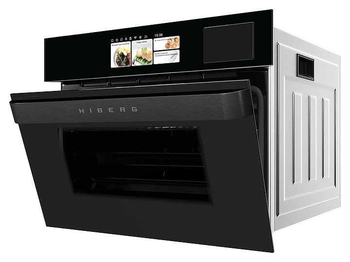 Встраиваемый электрический духовой шкаф Hiberg S-VMF 5515 B SMART предназначен для приготовления большого ассортимента блюд в домашних условиях. Модель оснащена камерой с расположенными в задней стенке вентилятором и кольцевым нагревательным элементом, верхним и нижним нагревательными элементами, грилем, парогенератором, 2 боковыми стойками с 5 уровнями направляющих для противней, откидной дверью со смотровым окном и уплощенной горизонтальной рукояткой, кабелем питания с вилкой, сенсорным TFT-дисплеем управления и индикации с цветными изображениями высокой четкости, символьными, текстовыми, графическими и цифровыми сегментами. Корпус выполнен из высококачественной стали, верхняя панель и дверь черного цвета с полным фронтальным остеклением из тонированного закаленного стекла без винтового крепежа, дно камеры – из стеклокерамики, боковые стойки, направляющие и решетка для гриля – из металла с хромированным покрытием, противни – из металла с эмалированным покрытием, рукоятка – из металла с черной матовой поверхностью.