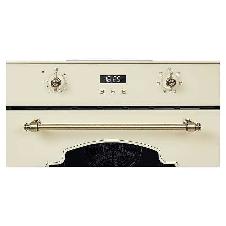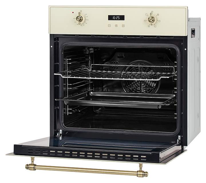 Встраиваемый электрический духовой шкаф Hiberg VM 6260 RY предназначен для приготовления большого ассортимента блюд в гостиничных комплексах и домашних условиях. Модель оснащена камерой с расположенным в задней стенке вентилятором, верхним и нижним нагревательными элементами, верхним грилем, 2 боковыми стойками с 5 уровнями направляющих для противней, откидной дверью со смотровым окном и горизонтальной цилиндрической рукояткой, кабелем питания, электромеханической панелью управления с 2 цилиндрическими поворотными переключателями, функциональными сенсорными клавишами и светодиодным цифровым дисплеем с белой подсветкой индикации. Корпус выполнен из высококачественной стали, верхняя панель и дверь бежевого оттенка с полным фронтальным остеклением из закаленного стекла без винтового крепежа, боковые стойки, направляющие и решетка для гриля – из металла с хромированным покрытием, противни – из металла с эмалированным покрытием, рукоятка трубчатой формы с декоративными наконечниками и фигурные ручки переключателей – из металла с поверхностью бронзового оттенка. Комплектация: