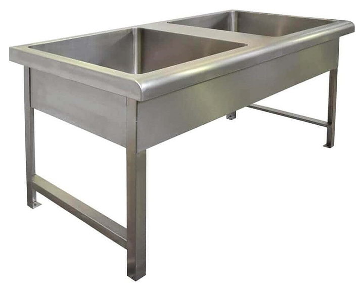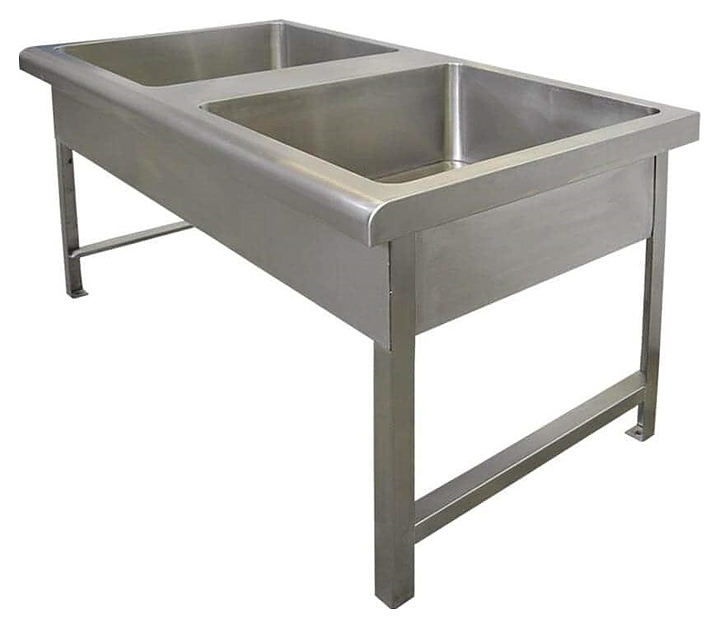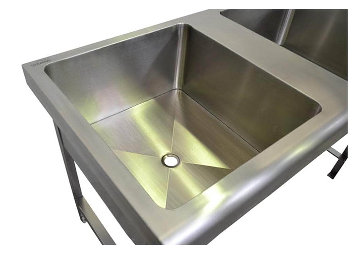 Напольная моечная ванна Oceanus 7-004.5 предназначена для мытья различного инвентаря на предприятиях общественного питания и торговли. Модель оснащена 2 раковинами прямоугольного сечения, невысоким фартуком с радиальным гибом с фронтальной стороны и 4 опорами. Изделие выполнено из высококачественной нержавеющей стали марки AISI 304 серебристого оттенка с матовой поверхностью. Особенности: