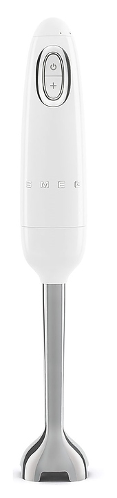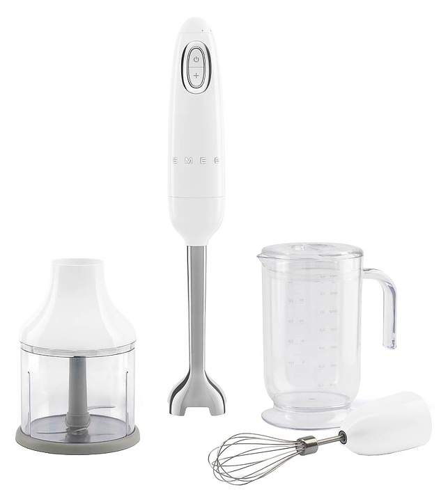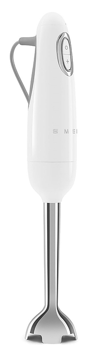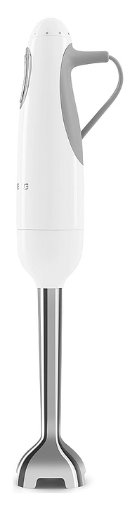Блендер Smeg HBF03WHEU предназначен для взбивания жидкого теста, кремов и коктейлей, измельчения фруктов, овощей, орехов и трав и приготовления супов-пюре в частных домах и квартирах. Модель выполнена в стиле 50-х годов. Устройство оснащено селектором скорости и эргономичной нескользящей ручкой. Корпус выполнен из пластика, ручка - из пластика Soft Touch, погружная часть и ножи- из нержавеющей стали. Комплектация: