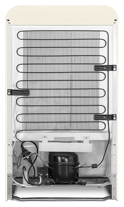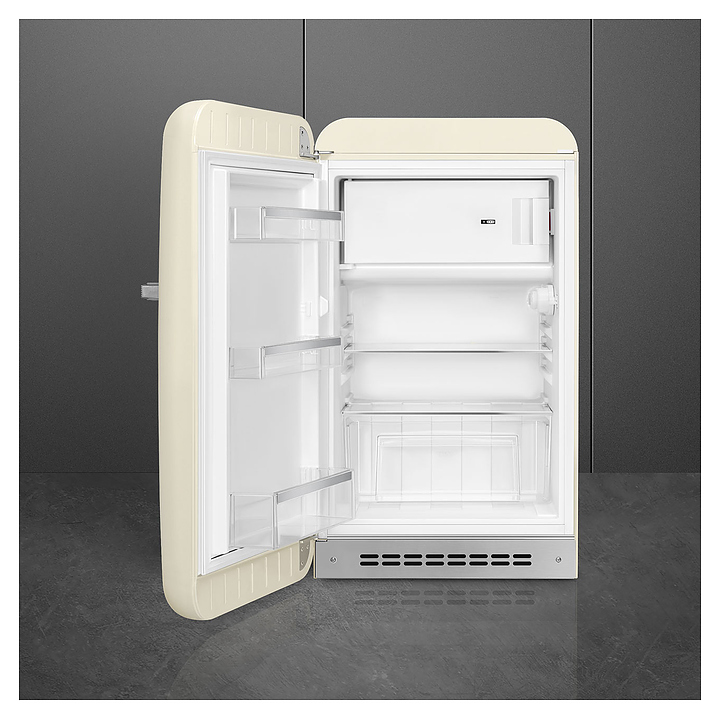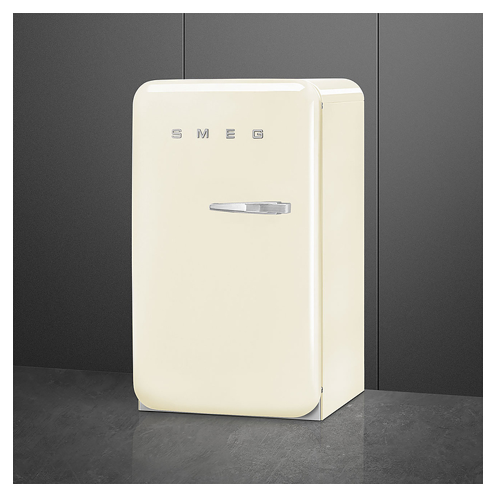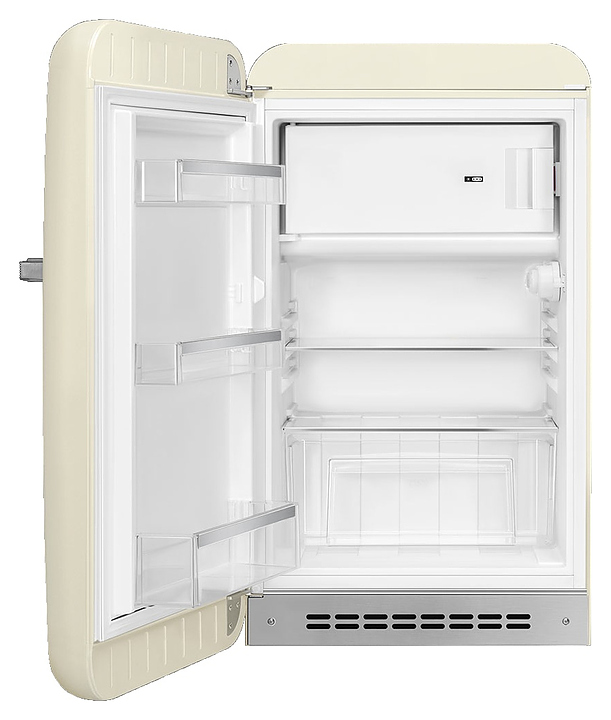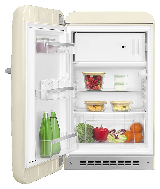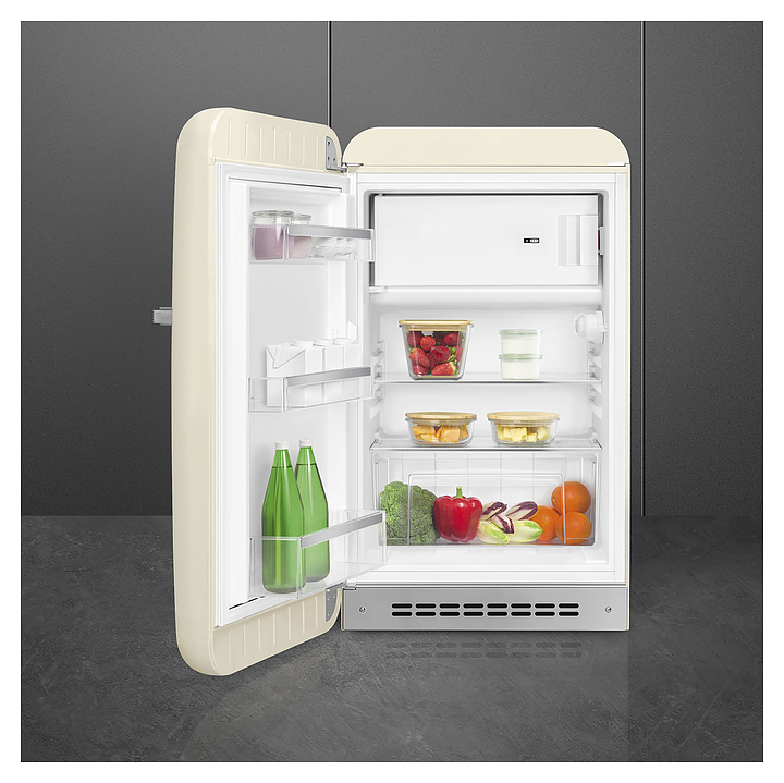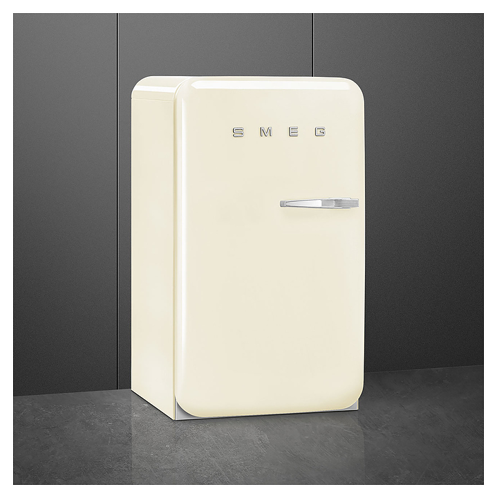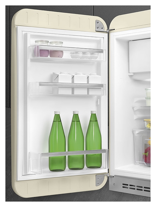 Холодильник SMEG FAB10LCR6 предназначен для охлаждения, заморозки, кратковременного и длительного хранения пищевых продуктов и напитков в гостиничных номерах, офисах, бытовых условиях и подсобных помещениях. Модель оснащена холодильной камерой с интегрированной в нее сверху морозильной камерой с распашной дверцей, цокольной решеткой, левосторонней распашной дверью с фиксированной горизонтальной рукояткой и накладными литерами логотипа в верхней части фронта, кабелем питания с евровилкой и расположенной в холодильной камере электромеханической панелью управления. Дверь выпуклой обтекаемой формы выполнена из термоформируемого полимера с глянцевой поверхностью кремового оттенка, боковины – из стали с антикоррозийным покрытием под цвет фронта, рукоятка и литеры логотипа с хромированным покрытием, внутренняя облицовка – из белого полимера, плоская полка и крышка ящика – из безопасного закаленного стекла, ящик и навесные полки – из прочного прозрачного полимера, окантовка полок – из металлического профиля с серебристой сатинированной поверхностью. Комплектация: