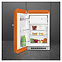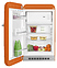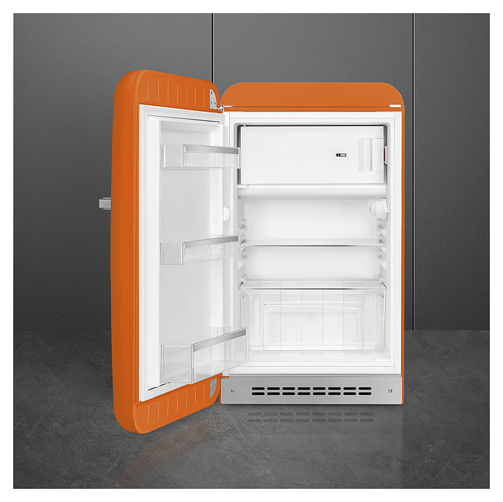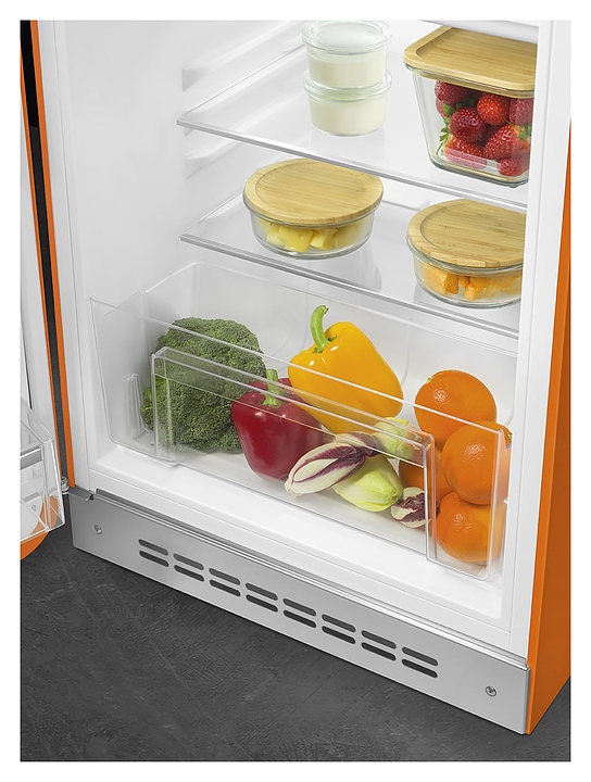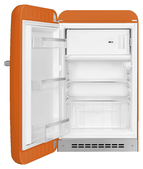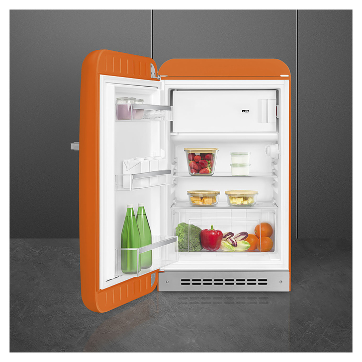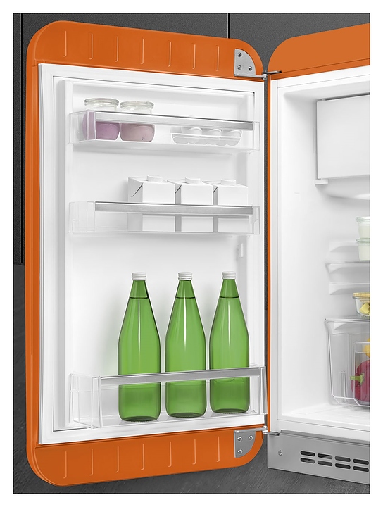 Холодильник SMEG FAB10LOR6 предназначен для охлаждения, заморозки, кратковременного и длительного хранения пищевых продуктов и напитков в гостиничных номерах, офисах, бытовых условиях и подсобных помещениях. Модель оснащена холодильной камерой с интегрированной в нее сверху морозильной камерой с распашной дверцей, цокольной решеткой, левосторонней распашной дверью с фиксированной горизонтальной рукояткой и накладными литерами логотипа в верхней части фронта, кабелем питания с евровилкой и расположенной в холодильной камере электромеханической панелью управления. Дверь выпуклой обтекаемой формы выполнена из термоформируемого полимера с глянцевой оранжевой поверхностью, боковины – из стали с антикоррозийным покрытием под цвет фронта, рукоятка и литеры логотипа с хромированным покрытием, внутренняя облицовка – из белого полимера, плоская полка и крышка ящика – из безопасного закаленного стекла, ящик и навесные полки – из прочного прозрачного полимера, окантовка полок – из металлического профиля с серебристой сатинированной поверхностью. Комплектация: