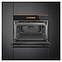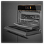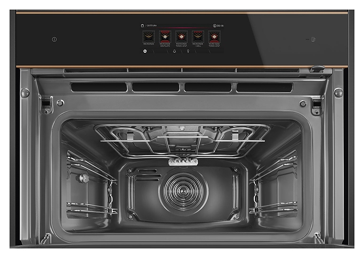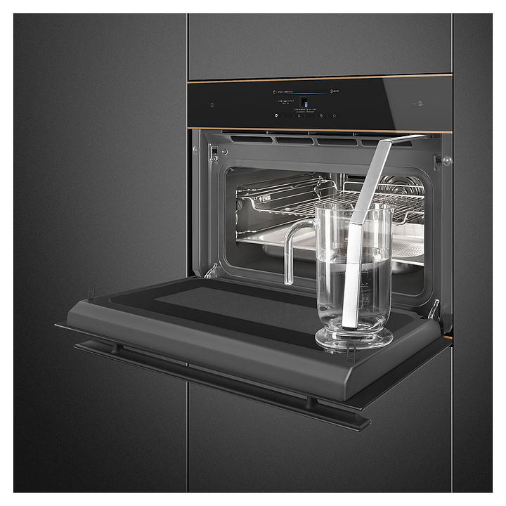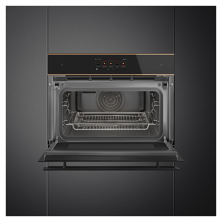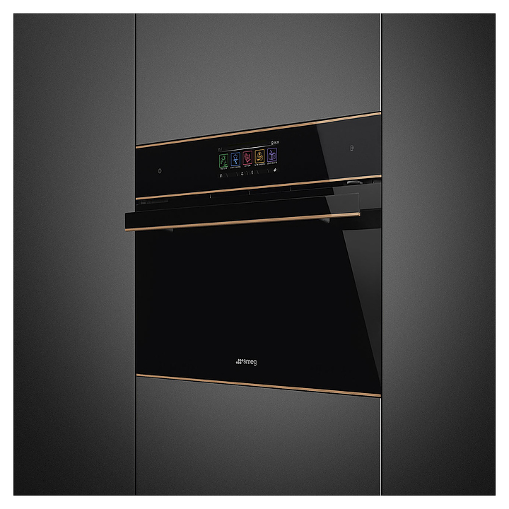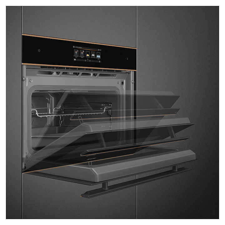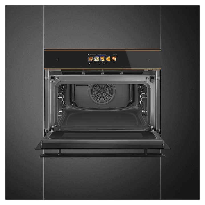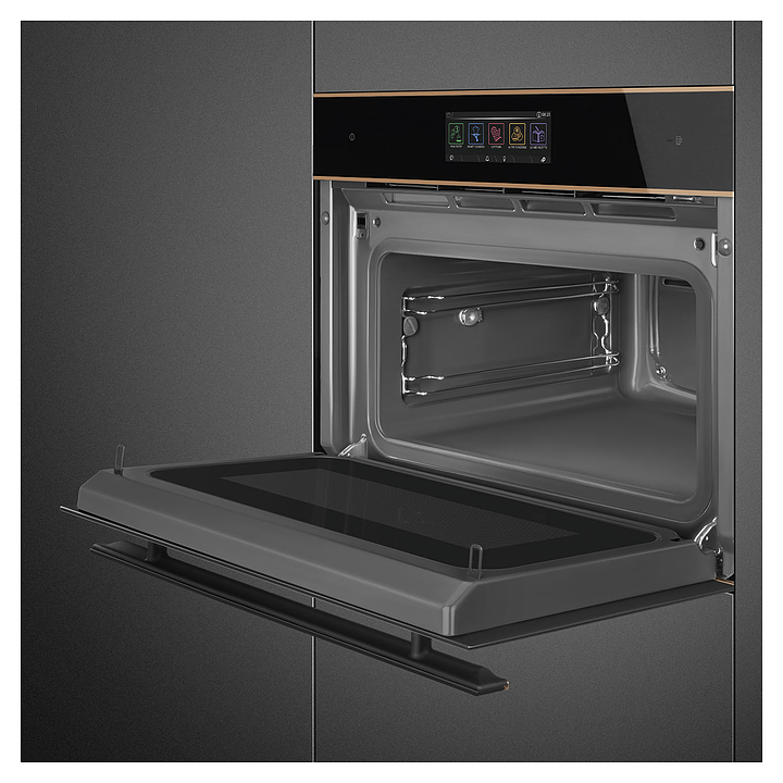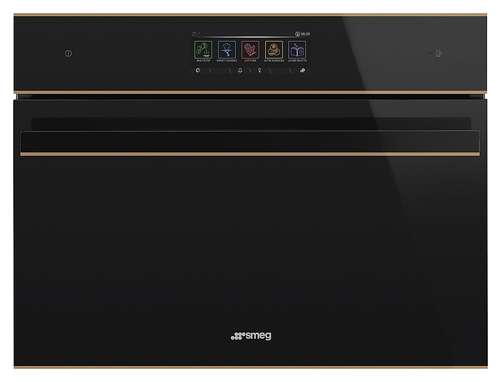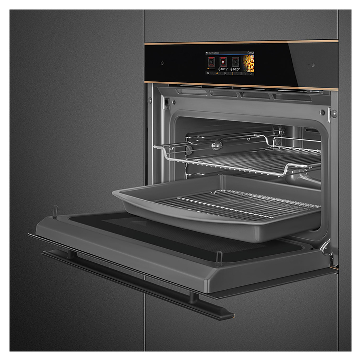 Электрический духовой шкаф SMEG SO4606WAPNR предназначен для приготовления большого ассортимента блюд в домашних условиях. Модель оснащена рабочей камерой GALILEO с верхним и нижним нагревательными элементамии, грилем, расположенными в задней стенке кольцевым нагревателем и вентилятором, магнетроном, парогенератором, 2 боковыми стойками с 2 уровнями направляющих для противней, откидной дверью со смотровым окном и длинной горизонтальной рукояткой, сенсорным управлением с TFT-дисплеем (VIVO Screen Max). Корпус выполнен из высококачественной стали, фронт черного цвета с полным глянцевым тонированным остеклением Eclipse без винтового крепежа и декоративными горизонтальными вставками медного оттенка, глубокий противень – из стали с эмалированным покрытием, решетки, стандартный и перфорированный противни – из нержавеющей стали, противень для микроволн – из стекла, боковые стойки и направляющие – из стали с хромированной поверхностью.