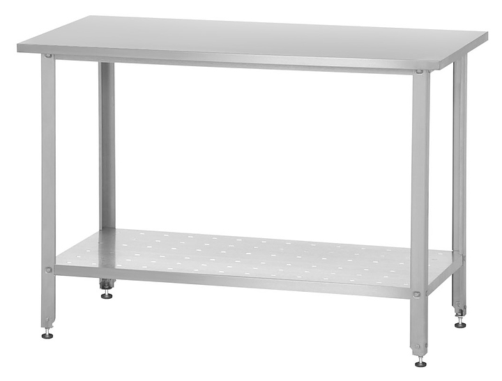 Производственный стол Mecon Base СПРб предназначен для разделывания и обработки пищевых продуктов, а также в качестве вспомогательной поверхности для кухонного оборудования на предприятиях пищевой промышленности, общественного питания и торговли. Модель оснащена усиленной перфорированной полкой и регулируемыми по высоте полиамидными опорами со стальными подпятниками. Каркас выполнен из уголка оцинкованной стали с подгибами, столешница - из шлифованной пищевой нержавеющей стали AISI 430 с усилением подложкой из ДСП, полка - из оцинкованной стали. Особенности: