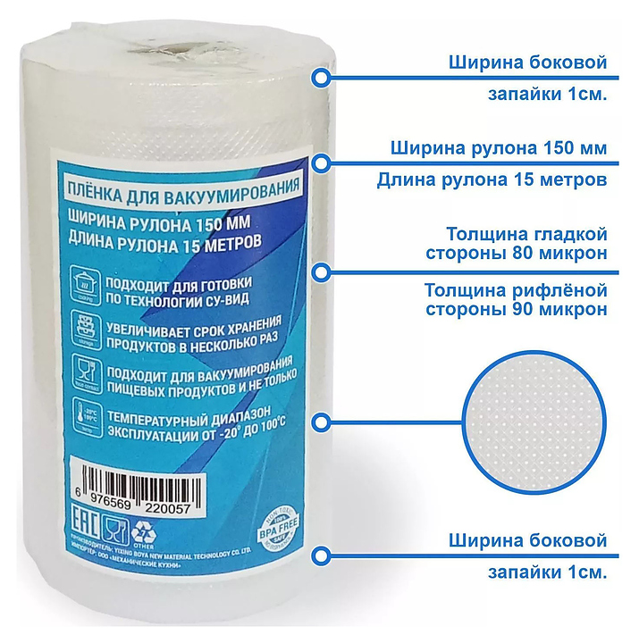 Совместимость: бескамерные упаковщики Amitek, Apach, BesserVacuum, Bomann, Bork, Caso, Clatronic, Fimar, FoodAtlas, Freshield, Gemlux, Gochu, Hurakan, Kitfort, Lavezzini, Magic Seal, Profi Cook, Redmond, Rommelsbacher, Steba, Tribest, QKer, Vac-Star, Vortmax, Zepter vacsy, Zigmund&Shtain и любых других, ширина запайки которых больше 150 мм.