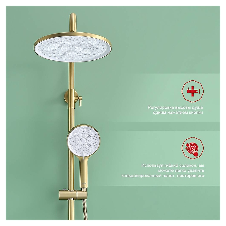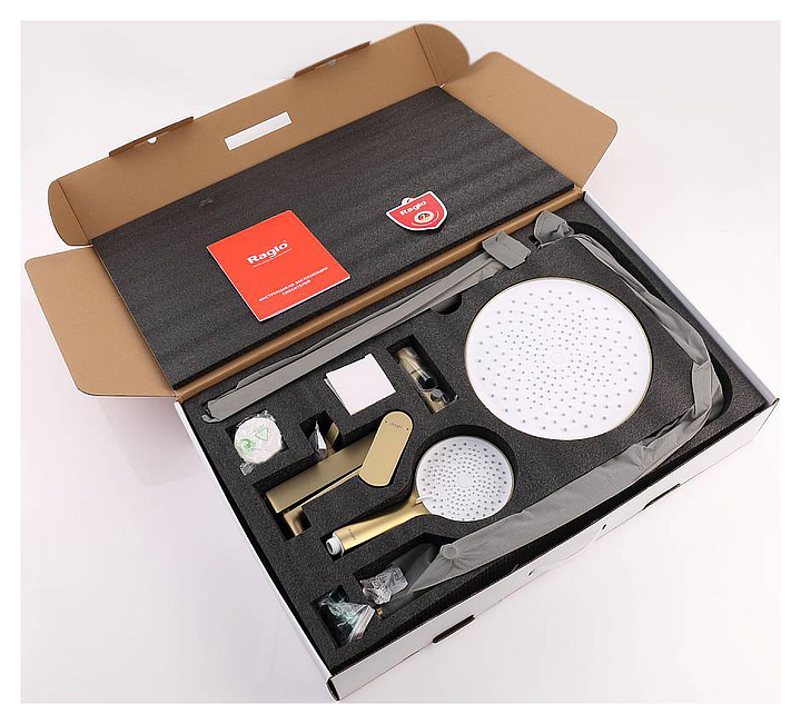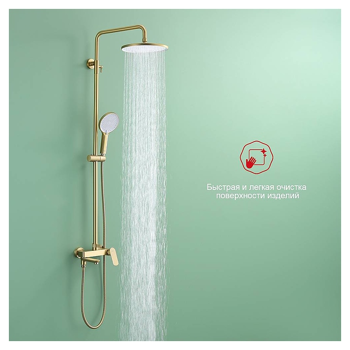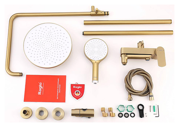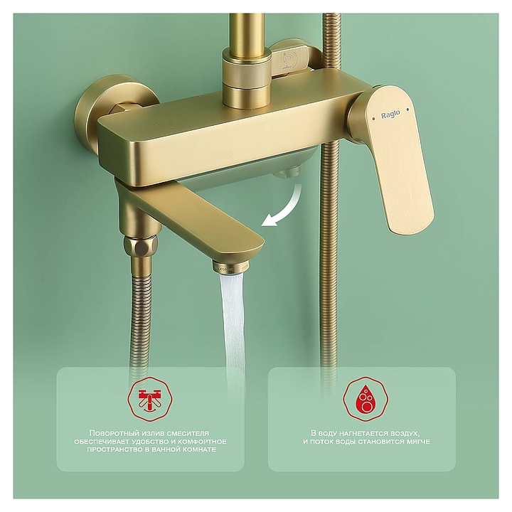 Душевая система Raglo R03.24.03 предназначена для подачи горячей и холодной воды в ванных помещениях. Модель оснащена регулируемой по высоте душевой штангой, круглыми верхним душем и ручной лейкой. Керамический картридж обеспечивает плавный ход рычага смесителя, контроль и точность при выборе напора и температуры воды. Излив оснащен аэратором, который создает мягкую струю без брызг. Изделие выполнено из высококачественной латуни, отличающейся прочностью, долговечностью и устойчивостью к перепадам температур, шланг - из металла, аэратор - из силикона. В комплект поставки входят верхний душ, душевая штанга с держателем лейки, ручной душ, смеситель и шланг. Особенности: