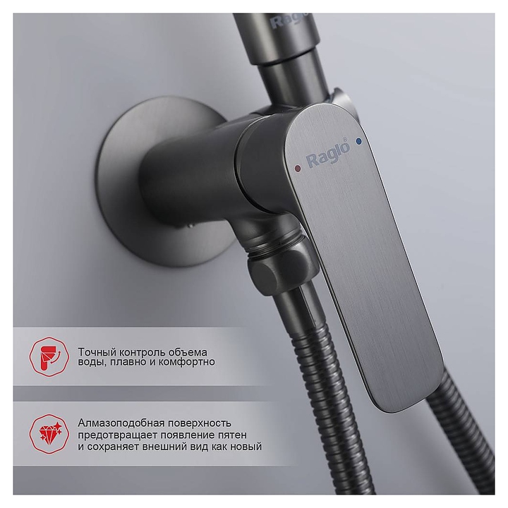 Гигиенический душ Raglo R03.52.09 предназначен для подачи горячей и холодной воды в туалетных комнатах. Модель оснащена керамическим картриджем, который обеспечивает плавный ход рычага смесителя, контроль и точность при выборе напора и температуры воды. Корпус выполнен из высококачественной латуни, отличающейся прочностью, долговечностью и устойчивостью к перепадам температуры, шланг - из металла, лейка - из ABS пластика. В комплект поставки входят смеситель, внутренняя часть, лейка и шланг. Особенности: