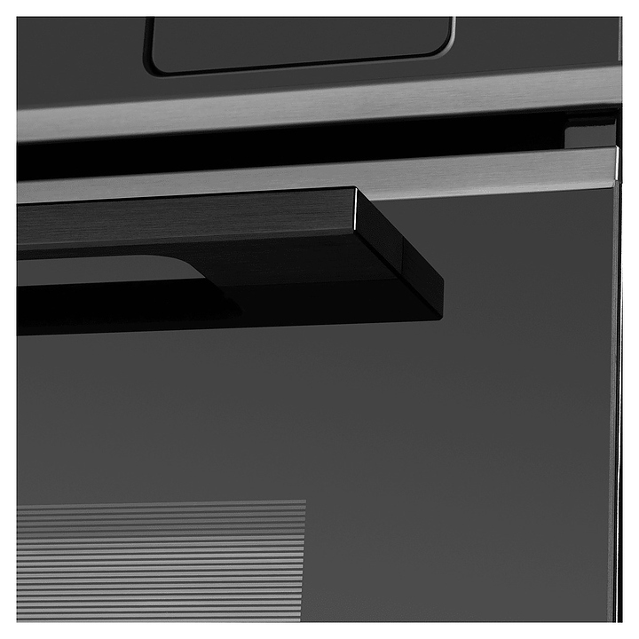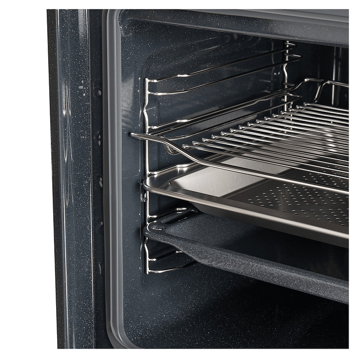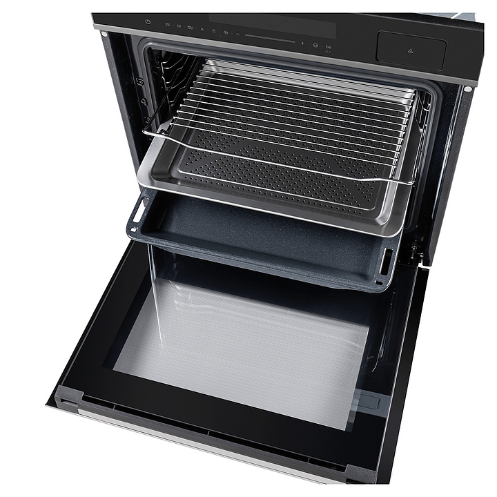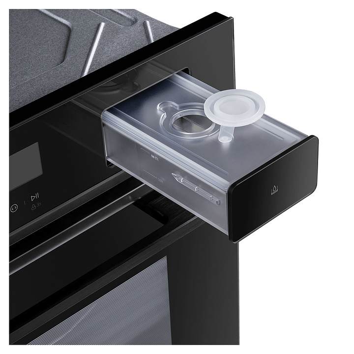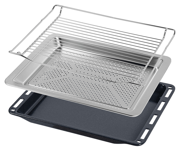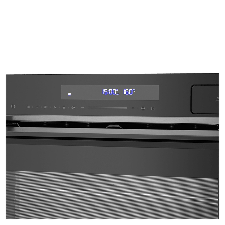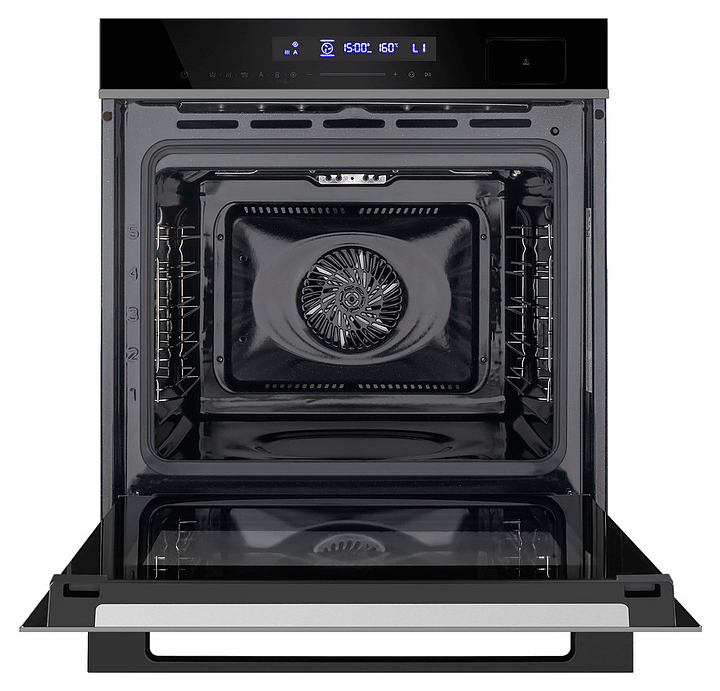 Встраивамый электрический духовой шкаф Maunfeld MEOR7216STB предназначен для приготовления большого ассортимента блюд в домашних условиях. Модель оснащена камерой с расположенными в задней стенке кольцевым нагревательным элементом и вентилятором, парогенератором, верхним и нижним нагревательными элементами, верхним грилем, 2 боковыми стойками с 5 уровнями направляющих для противней, откидной дверью со смотровым окном, горизонтальной рукояткой, кабелем питания с вилкой, расположенной в верхней части фронта панелью управления с сенсорными функциональными клавишами и информативным светодиодным дисплеем с белой подсветкой индикации. Корпус выполнен из высококачественной стали, фронт с покрытием черного цвета и частичным остеклением без винтового крепежа прозрачным стеклом, горизонтальные вставки на двери и верхней панели – из металла с сатинированной поверхностью цвета черная нержавеющая сталь, боковые стойки и решетка для гриля – из стали с хромированной поверхностью, сплошной противень – из стали с эмалированным покрытием, перфорированный противень – из нержавеющей стали, рукоятка – из металла с черной матовой поверхностью.