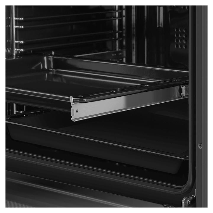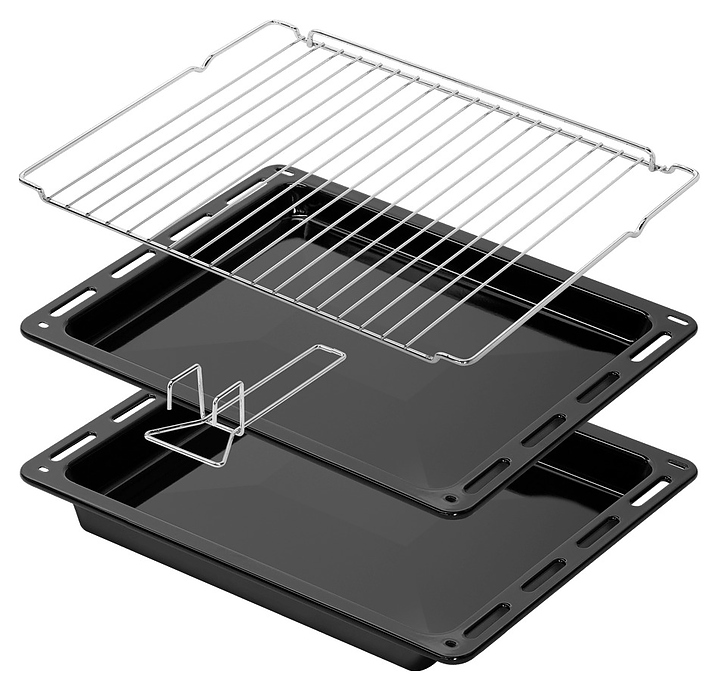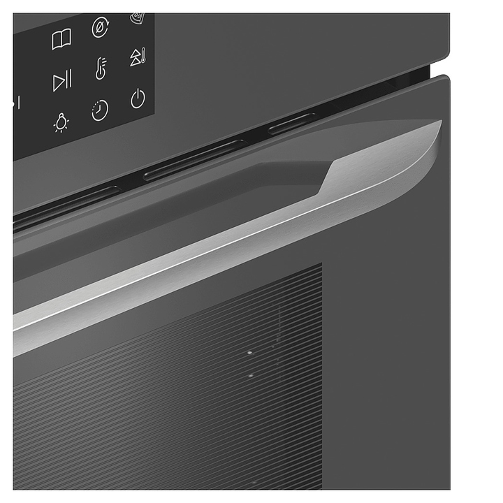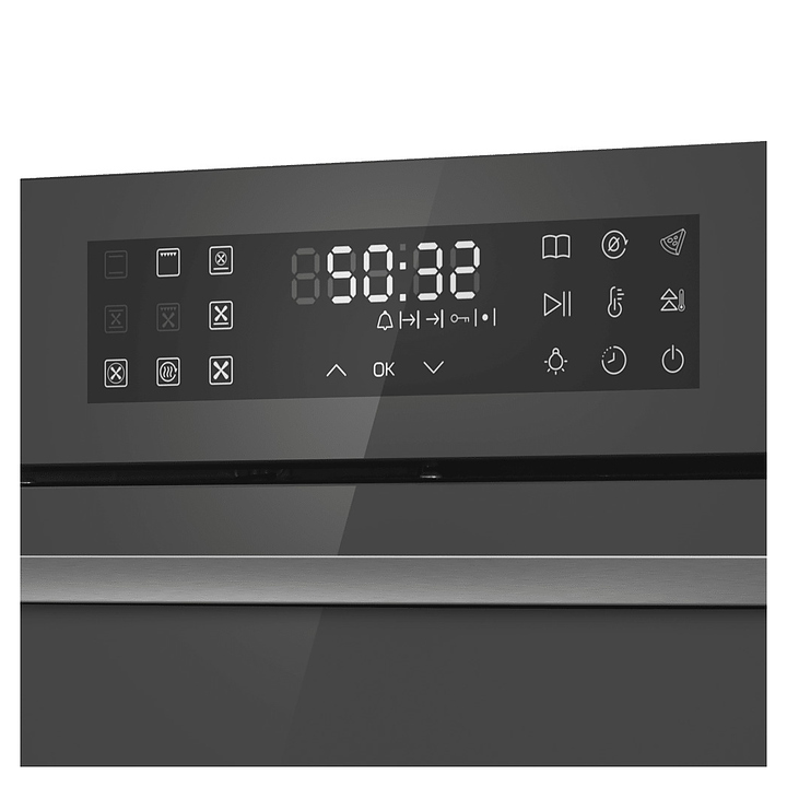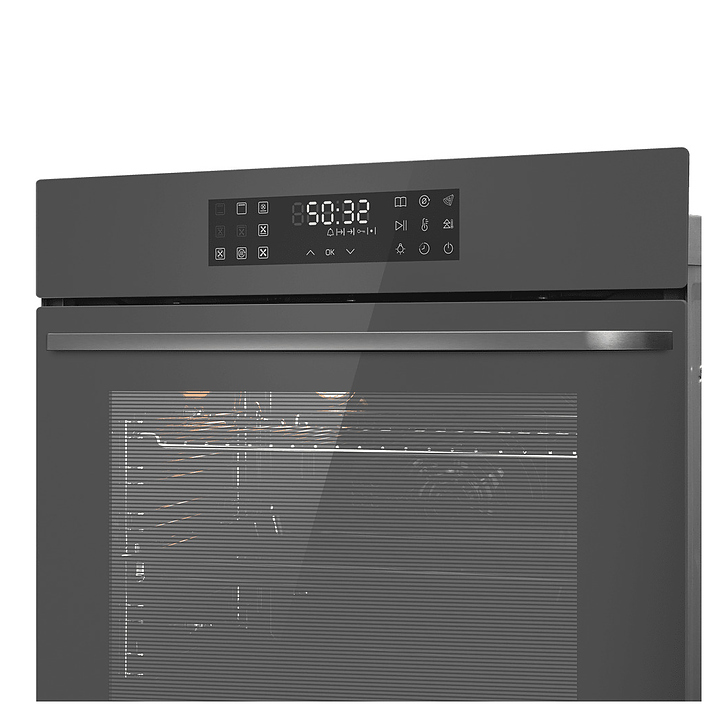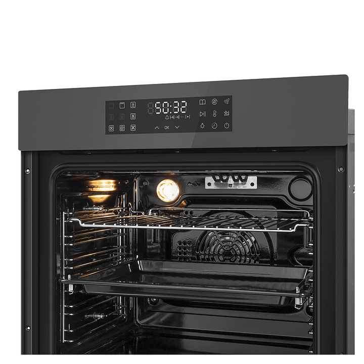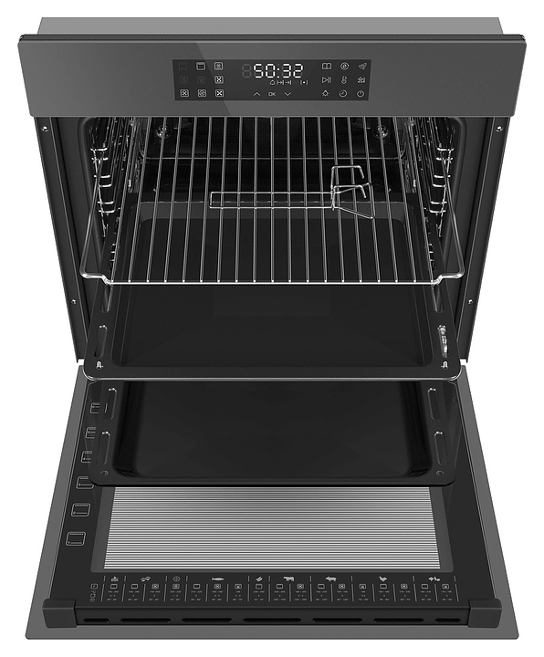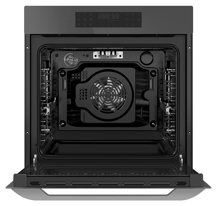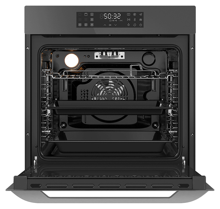 Встраивамый электрический духовой шкаф Maunfeld EOEH7614LGR предназначен для приготовления большого ассортимента блюд в домашних условиях. Модель оснащена камерой с расположенными в задней стенке кольцевым нагревательным элементом и вентилятором, верхним и нижним нагревательными элементами, верхним грилем, 2 боковыми стойками с 6 уровнями направляющих для противней, откидной дверью со смотровым окном, горизонтальной рукояткой, кабелем питания с вилкой, расположенной в верхней части фронта панелью управления с сенсорными функциональными клавишами и информативным дисплеем с белой подсветкой индикации. Корпус выполнен из высококачественной стали, фронт с покрытием темно-серого цвета и полным остеклением без винтового крепежа прозрачным закаленным стеклом, боковые стойки, телескопические направляющие, решетка для гриля и прихват – из стали с хромированной поверхностью, противни – из стали с эмалированным покрытием, рукоятка – из металла с матовой поверхностью цвета нержавеющей стали.