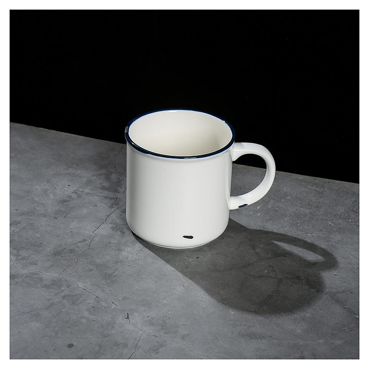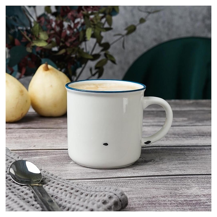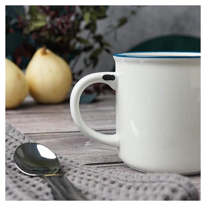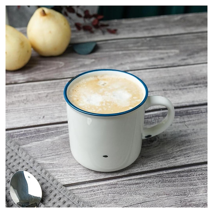 Кружка P.L. Proff Cuisine WM7142009-SH108 Bakery Fusion используется на предприятиях общественного питания и в домашних условиях для подачи молока. Емкость круглого сечения оснащена расширенным в основании бортом и дугообразной рукояткой. Изделие выполнено из фарфора с белой поверхностью, синей окантовкой на кромке и оригинальным винтажным декором с имитацией сколов эмали на поверхности состаренной металлической посуды. Цена указана за 1 шт. Особенности: