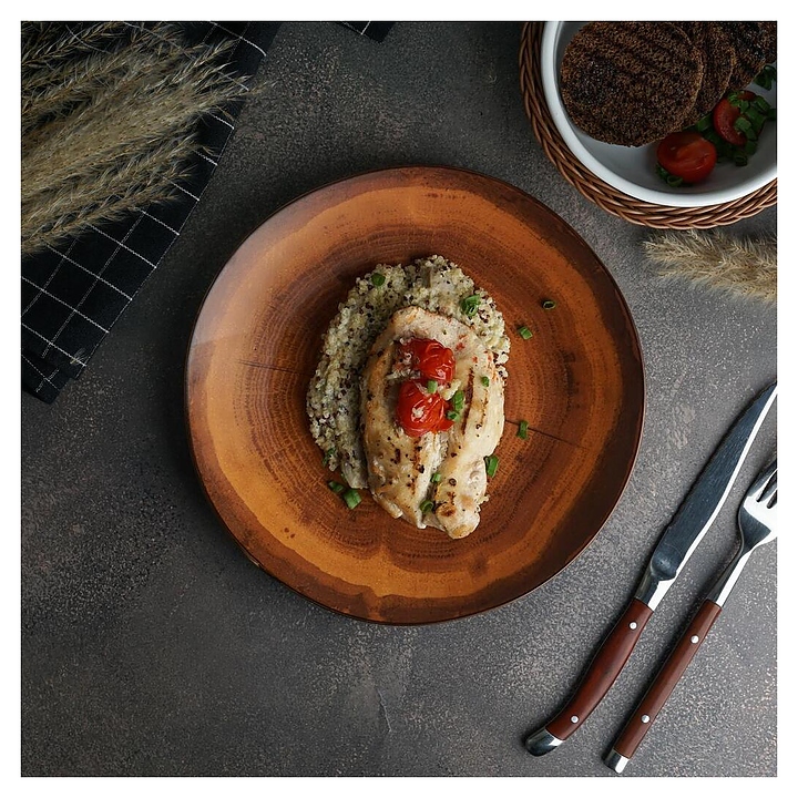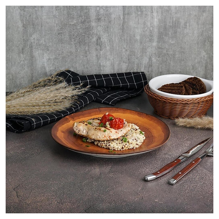 Тарелка P.L. Proff Cuisine WM 246123 Wood Fusion используется на предприятиях общественного питания и в домашних условиях для подачи различных блюд. Емкость круглого сечения оснащена плавно расширенным кверху бортом. Изделие выполнено из фарфора, внутренняя поверхность чаши стилизована под древесиный спил с годичными кольцами и трещинками в коричневых тонах, внешняя поверхность – под окрашенную в белый цвет древесину, кромка с коричневой окантовкой. Цена указана за 1 шт. Особенности: