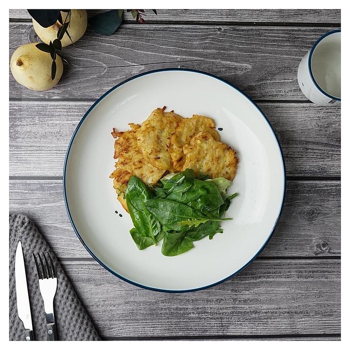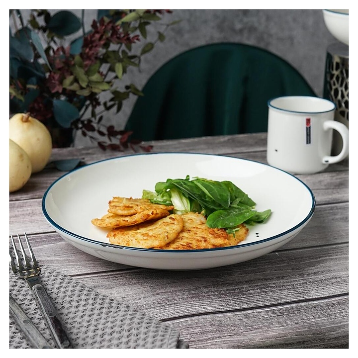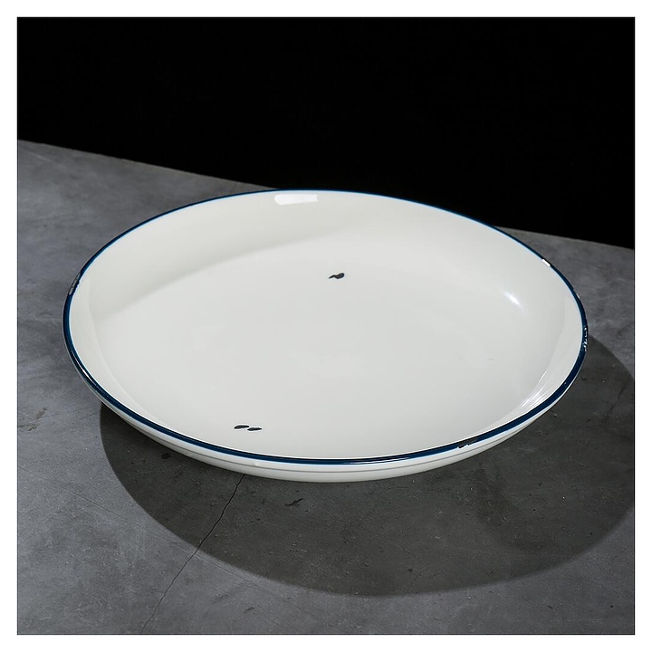 Тарелка P.L. Proff Cuisine WM0112231-SH108 Bakery Fusion используется на предприятиях общественного питания и в домашних условиях для подачи различных блюд. Емкость круглого сечения оснащена плавно расширенным кверху бортом. Изделие выполнено из фарфора с белой поверхностью, синей окантовкой на кромке и оригинальным винтажным декором с имитацией сколов эмали на поверхности состаренной металлической посуды. Цена указана за 1 шт. Особенности: