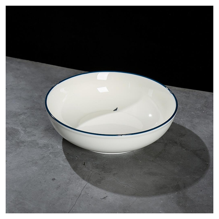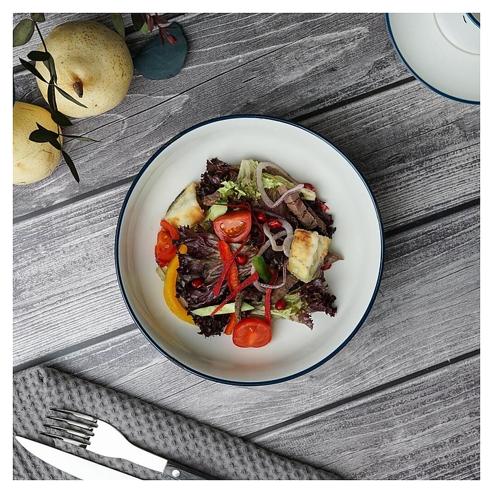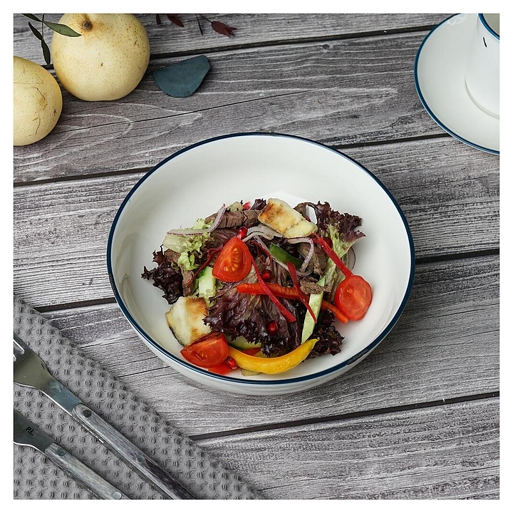 Салатник P.L. Proff Cuisine WM6086021-SH108 Bakery Fusion используется на предприятиях общественного питания и в домашних условиях для подачи салатов. Емкость круглого сечения оснащена плавно расширенным к кромке бортом. Изделие выполнено из фарфора с белой поверхностью, синей окантовкой на кромке и оригинальным винтажным декором с имитацией сколов эмали на поверхности состаренной металлической посуды. Цена указана за 1 шт. Особенности: