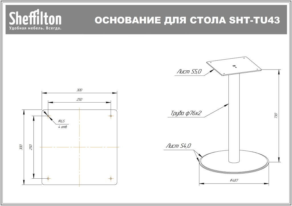 Подстолье Sheffilton SHT-TU43 используется в качестве опоры для столешницы обеденного столика в кафе, ресторанах и на других предприятиях общественного питания и торговли. Модель имеет устойчивую конструкцию из опорной плоскости квадратной формы, опорной стойки круглого сечения и круглого основания на 6 ножках. Компоненты выполнены из металла с покрытием порошковой краской оттенка черный муар, упаковка – из картона. Цена указана за 1 шт. Особенности: