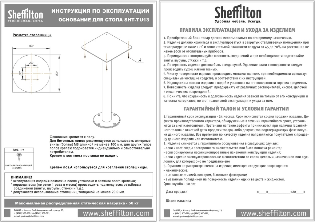 Подстолье Sheffilton SHT-TU13 используется в качестве опоры для столешницы обеденного столика в кафе, ресторанах и на других предприятиях общественного питания и торговли. Модель имеет устойчивую конструкцию из опорной плоскости квадратной формы, опорной стойки круглого сечения и круглого основания. Компоненты выполнены из металла с покрытием порошковой краской оттенка черный муар, упаковка – из полиэтилена. Цена указана за 1 шт. Особенности:
