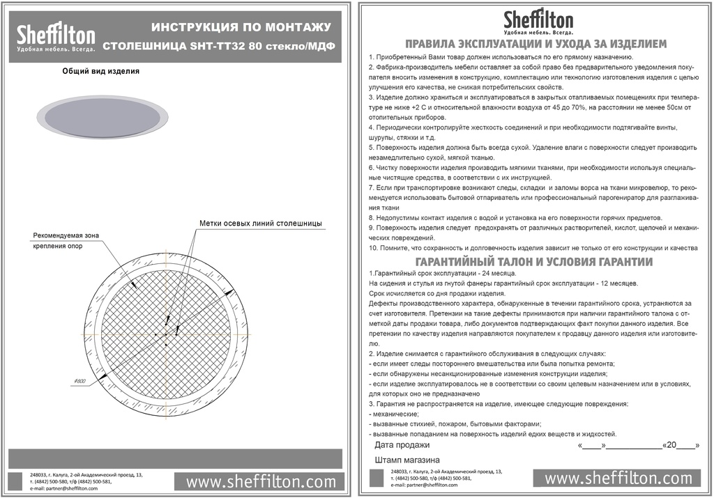 Столешница Sheffilton SHT-TT32 80 используется совместно с подстольями соответствующих размеров для обеденных столиков в кафе, ресторанах и на других предприятиях общественного питания и торговли. Лицевая поверхность круглой формы изготовлена из безопасного закаленного стекла с выполненным методом ультрафиолетовой печати принтом «синий сапфир», круглое основание – из древесноволокнистой плиты средней плотности (МДФ) без содержания токсичных примесей, упаковка – из картона и полиэтилена. Цена указана за 1 шт. Особенности: