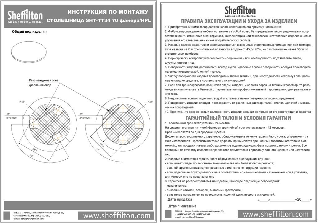 Столешница Sheffilton SHT-TT34 70 используется совместно с подстольями соответствующих размеров для обеденных столиков в кафе, ресторанах и на других предприятиях общественного питания и торговли. Лицевая поверхность круглой формы выполнена из ламината высокого давления (HPL) белого цвета, основание –из фанеры со скошенным книзу торцом, упаковка – из картона. Цена указана за 1 шт. Особенности: