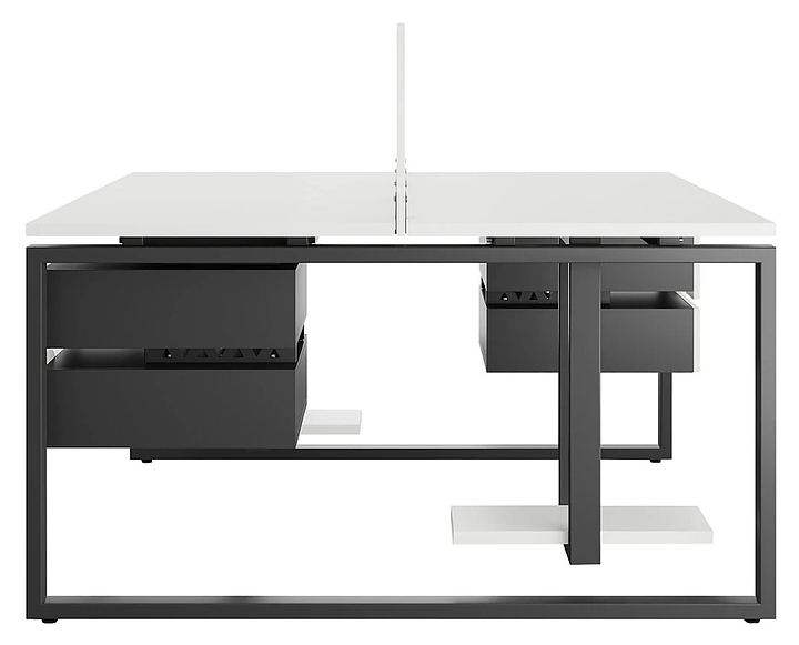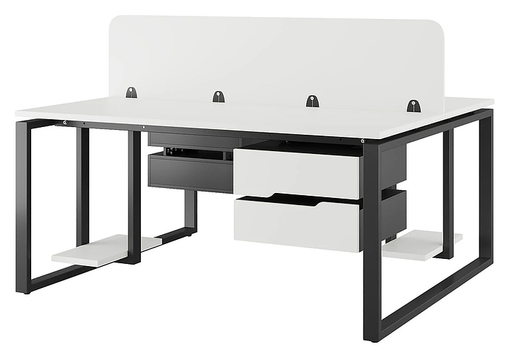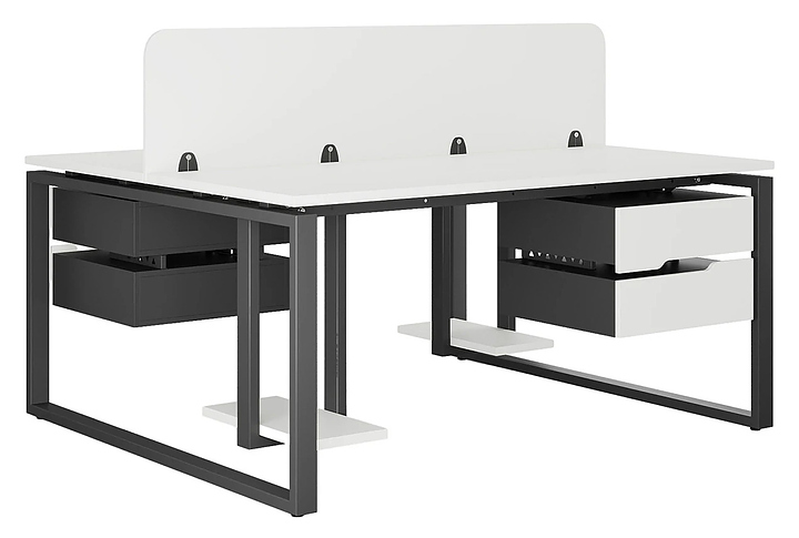 Офисный стол Кобор O1/2-100/140 black/premium на 2 рабочих места используется в офисных помещениях и кабинетах руководителей. Модель оснащена O-образными опорами. Каркас и опоры выполнены из металла, выкрашенного в цвет черный муар (RAL9005), столешница – из ламинированной древесно-стружечной плиты (ЛДСП) цвета белый премиум (W1000 ST9). Дополнительные характеристики:
