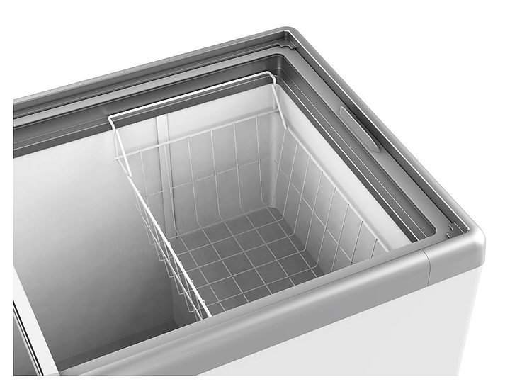 Морозильный ларь Aucma SD-600 предназначен для охлаждения, заморозки, кратковременного и длительного хранения пищевых продуктов таких как мясо, овощи, полуфабрикаты и мороженое на малых предприятиях общественного питания и торговли, гостиничных комплексах, офисах и домашних условиях. Модель оснащена горизонтально ориентированной рабочей камерой с раздвижными дверьми сверху с небольшими уплощенными рукоятками, кабелем питания с евровилкой и расположенной в нижней части боковой стенки электромеханической панелью управления. Корпус выполнен из металла с антикоррозийным покрытием белого цвета, верхняя окантовка корпуса – из формованного АБС пластика с серебристой поверхностью, внутренние стенки камеры – из пластифицированного металла с белой поверхностью, крышки – из безопасного закаленного стекла в пластиковой раме, корзины – из металла с полимерным покрытием. В комплект поставки входят 6 съемных решетчатых корзин и скребок для льда. Особенности: