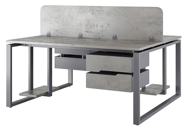 Офисный стол Кобор O1/2-80/120 graphite/chicago на 2 рабочих места используется в офисных помещениях и кабинетах руководителей. Модель оснащена O-образными опорами. Каркас и опоры выполнены из металла, выкрашенного в цвет графит муар (RAL7024), столешница – из ламинированной древесно-стружечной плиты (ЛДСП) цвета бетон чикаго (F186 ST9). Дополнительные характеристики:
