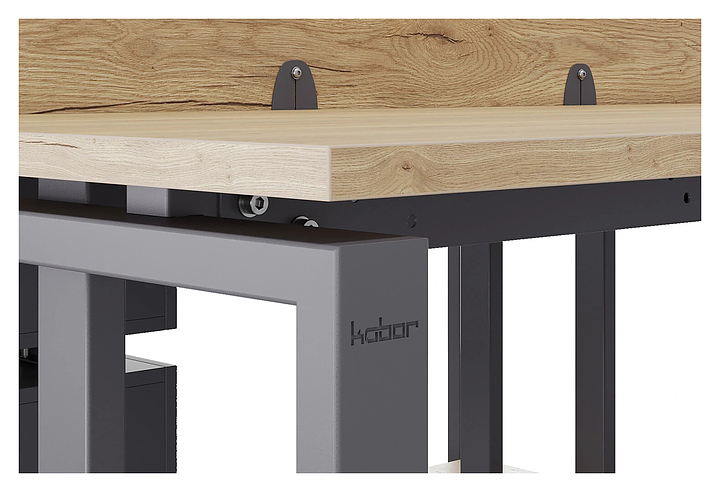 Офисный стол Кобор O1/2-100/120 graphite/natural на 2 рабочих места используется в офисных помещениях и кабинетах руководителей. Модель оснащена O-образными опорами. Каркас и опоры выполнены выполнены из металла, выкрашенного в цвет графит муар (RAL7024), столешница – из ламинированной древесно-стружечной плиты (ЛДСП) цвета натуральный дуб (H1180 ST37). Дополнительные характеристики: