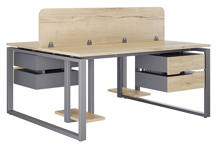 Офисный стол Кобор O1/2-120/120 graphite/natural на 2 рабочих места используется в офисных помещениях и кабинетах руководителей. Модель оснащена O-образными опорами. Каркас и опоры выполнены выполнены из металла, выкрашенного в цвет графит муар (RAL7024), столешница – из ламинированной древесно-стружечной плиты (ЛДСП) цвета натуральный дуб (H1180 ST37). Дополнительные характеристики: