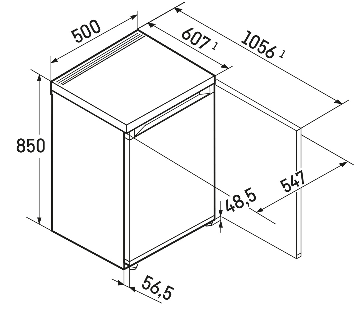 Глубина с открытой под прямым углом дверью: 1056 мм