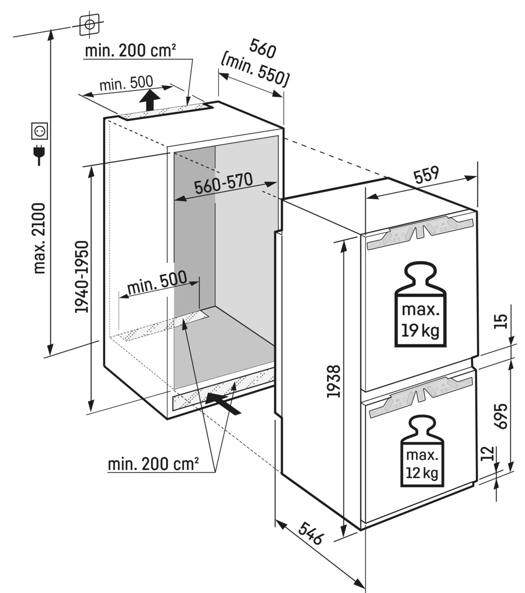 Встраиваемый холодильник Liebherr ICNd 5603 серии Pure предназначен для охлаждения, замораживания, кратковременного и длительного хранения пищевых продуктов и напитков в гостиничных комплексах, офисах, а также домашних условиях. Модель оснащена холодильной камерой сверху и морозильной камерой снизу, правосторонними перенавешиваемыми распашными дверьми, кабелем питания с евровилкой, расположенными за дверью холодильной камеры в верхней части фронта сенсорной панелью управления и монохромным жидкокристаллическим дисплеем с белой подсветкой индикации. Боковины и фасады дверей выполнены из стали, внутренняя облицовка камер – из белого пластика, плоские полки – из прозрачного закаленного стекла, решетчатая полка – из стали с хромированной поверхностью, ящики и навесные полки – из белого пластика с прозрачным фронтом, ящики и полки декорированы металлическими окантовками серебристого оттенка, упаковка – из гофрокартона, полимерной пленки и полистирола.