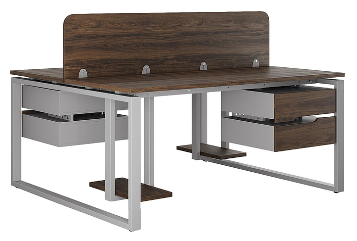 Офисный стол Кобор O1/2-80/140 aluminum/charlston на 2 рабочих места используется в офисных помещениях и кабинетах руководителей. Модель оснащена O-образными опорами. Каркас и опоры выполнены из металла, выкрашенного в цвет алюминиевый металлик (RAL9006), столешница – из ламинированной древесно-стружечной плиты (ЛДСП) цвета дуб чарльстон (H3154 ST36). Дополнительные характеристики: