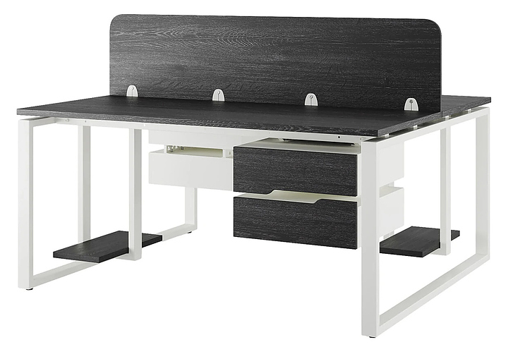 Офисный стол Кобор O1/2-180/140 white/glazed на 2 рабочих места используется в офисных помещениях и кабинетах руководителей. Модель оснащена O-образными опорами. Каркас и опоры выполнены из металла, выкрашенного в цвет белый муар (RAL9016), столешница – из ламинированной древесно-стружечной плиты (ЛДСП) цвета черный дуб (H3178 ST37). Дополнительные характеристики:
