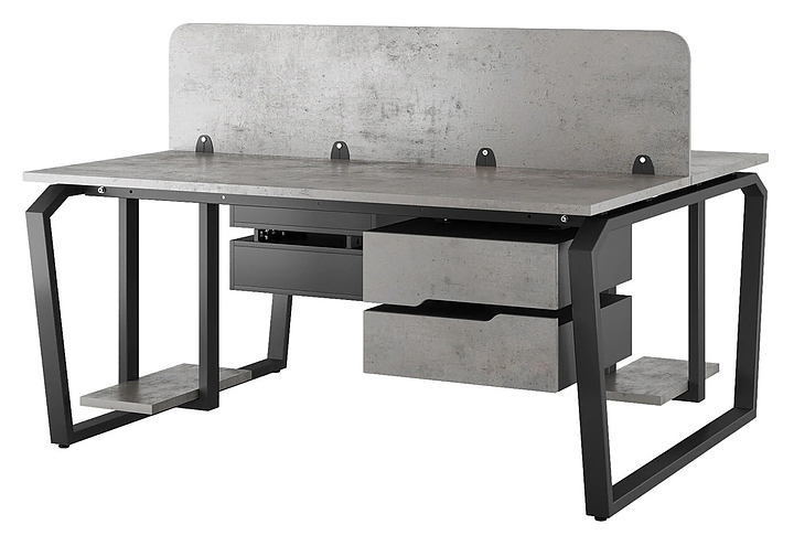 Офисный стол Кобор TB/2-100/120 black/chicago на 2 рабочих места используется в офисных помещениях и кабинетах руководителей. Модель оснащена опорами в форме обратной трапеции со скошенными верхними углами. Каркас и опоры выполнены из металла, выкрашенного в цвет черный муар (RAL9005), столешница – из ламинированной древесно-стружечной плиты (ЛДСП) цвета бетон чикаго (F186 ST9). Дополнительные характеристики: