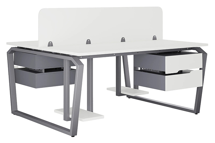 Офисный стол Кобор TB/2-80/140 graphite/premium на 2 рабочих места используется в офисных помещениях и кабинетах руководителей. Модель оснащена опорами в форме обратной трапеции со скошенными верхними углами. Каркас и опоры выполнены из металла, выкрашенного в цвет графит муар (RAL7024), столешница – из ламинированной древесно-стружечной плиты (ЛДСП) цвета белый премиум (W1000 ST9). Дополнительные характеристики: