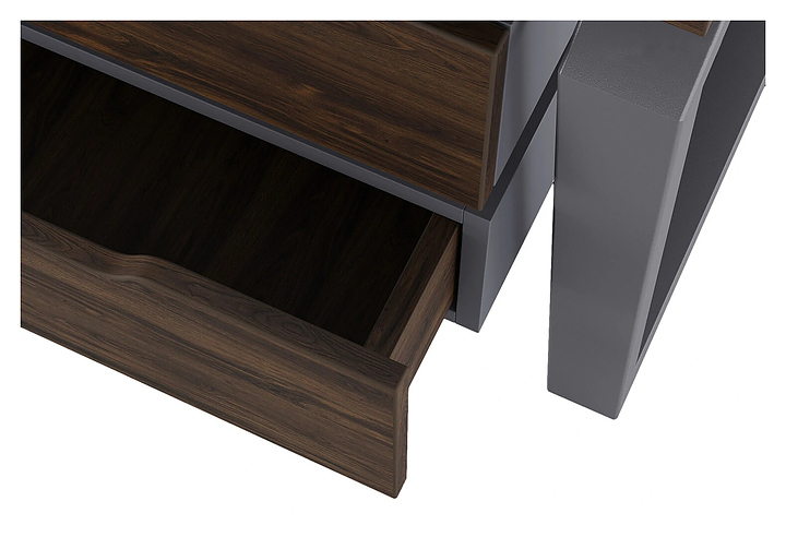 Офисный стол Кобор TB/2-80/140 graphite/charlston на 2 рабочих места используется в офисных помещениях и кабинетах руководителей. Модель оснащена опорами в форме обратной трапеции со скошенными верхними углами. Каркас и опоры выполнены из металла, выкрашенного в цвет графит муар (RAL7024), столешница – из ламинированной древесно-стружечной плиты (ЛДСП) цвета дуб чарльстон (H3154 ST36). Дополнительные характеристики: