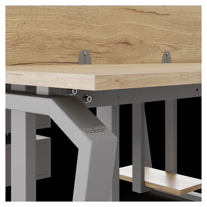 Офисный стол Кобор TB/2-100/140 aluminum/natural на 2 рабочих места используется в офисных помещениях и кабинетах руководителей. Модель оснащена опорами в форме обратной трапеции со скошенными верхними углами. Каркас и опоры выполнены из металла, выкрашенного в цвет алюминиевый металлик (RAL9006), столешница – из ламинированной древесно-стружечной плиты (ЛДСП) цвета натуральный дуб (H1180 ST37). Дополнительные характеристики:
