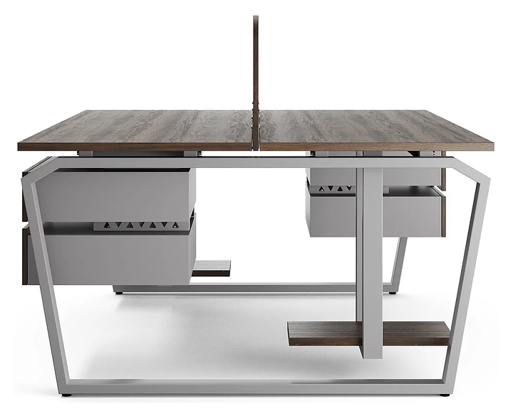 Офисный стол Кобор TB/2-120/120 aluminum/charlston на 2 рабочих места используется в офисных помещениях и кабинетах руководителей. Модель оснащена опорами в форме обратной трапеции со скошенными верхними углами. Каркас и опоры выполнены из металла, выкрашенного в цвет алюминиевый металлик (RAL9006), столешница – из ламинированной древесно-стружечной плиты (ЛДСП) цвета дуб чарльстон (H3154 ST36). Дополнительные характеристики: