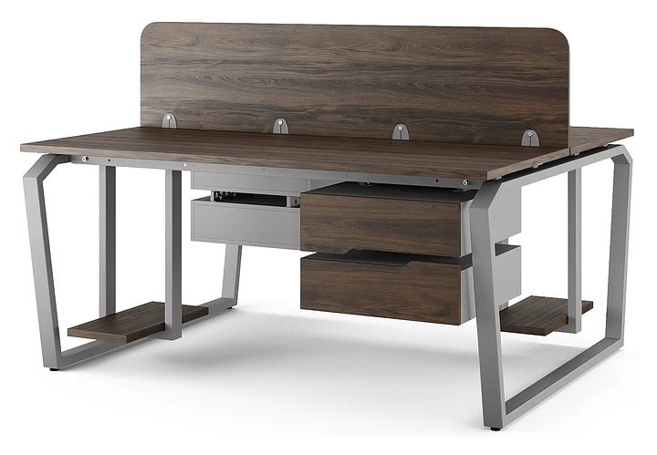 Офисный стол Кобор TB/2-120/140 aluminum/charlston на 2 рабочих места используется в офисных помещениях и кабинетах руководителей. Модель оснащена опорами в форме обратной трапеции со скошенными верхними углами. Каркас и опоры выполнены из металла, выкрашенного в цвет алюминиевый металлик (RAL9006), столешница – из ламинированной древесно-стружечной плиты (ЛДСП) цвета дуб чарльстон (H3154 ST36). Дополнительные характеристики: