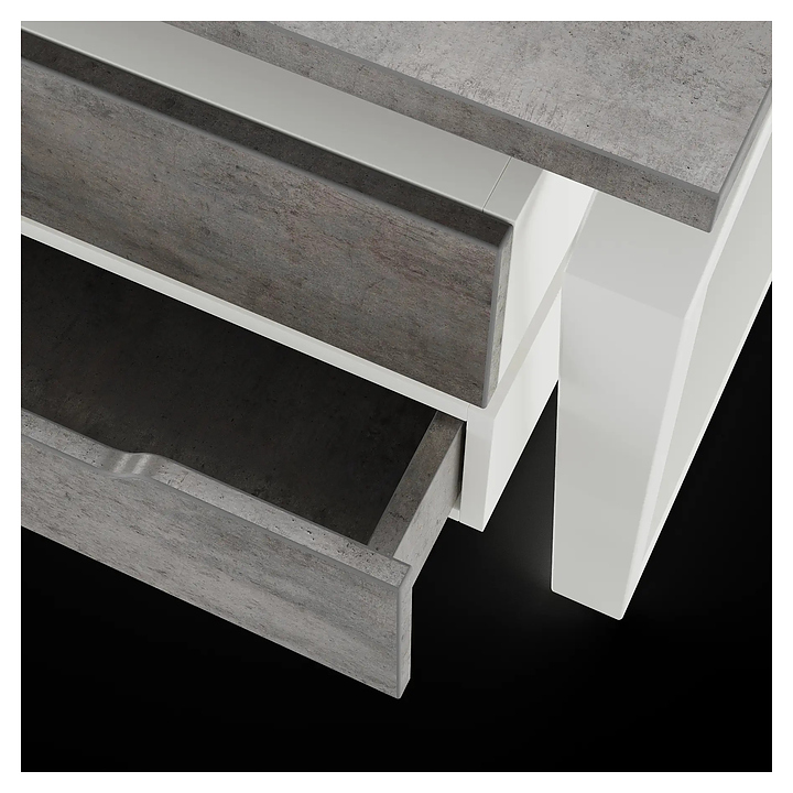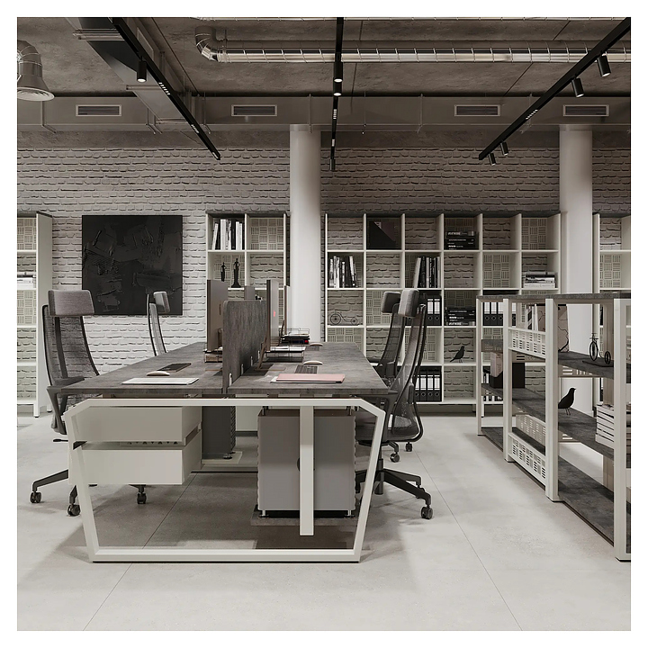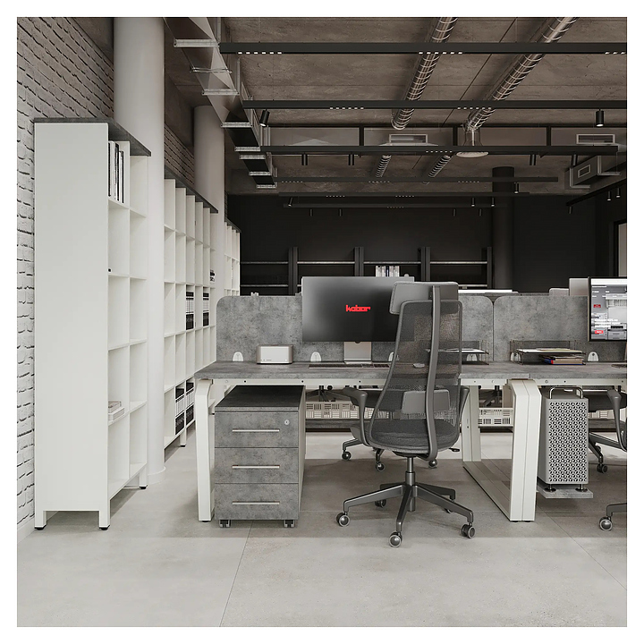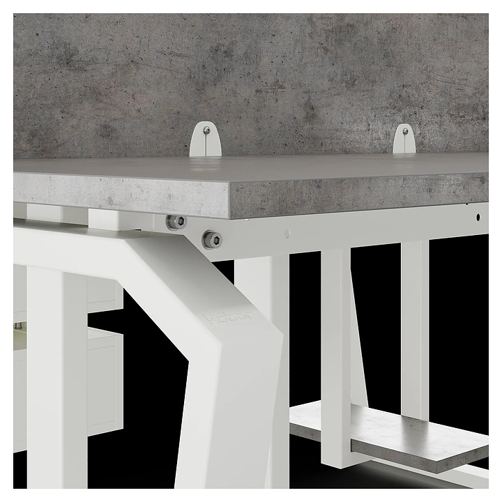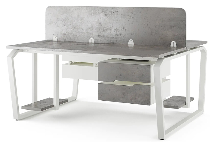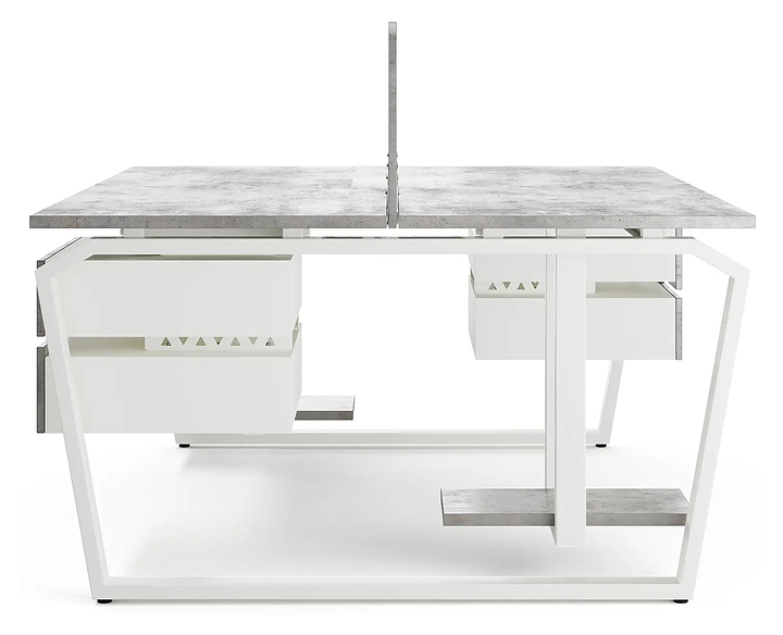 Офисный стол Кобор TB/2-80/140 white/chicago на 2 рабочих места используется в офисных помещениях и кабинетах руководителей. Модель оснащена опорами в форме обратной трапеции со скошенными верхними углами. Каркас и опоры выполнены из металла, выкрашенного в цвет белый муар (RAL9016), столешница – из ламинированной древесно-стружечной плиты (ЛДСП) цвета бетон чикаго (F186 ST9). Дополнительные характеристики: