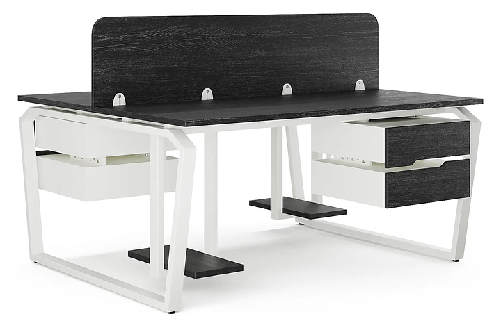 Офисный стол Кобор TB/2-80/140 white/glazed на 2 рабочих места используется в офисных помещениях и кабинетах руководителей. Модель оснащена опорами в форме обратной трапеции со скошенными верхними углами. Каркас и опоры выполнены из металла, выкрашенного в цвет белый муар (RAL9016), столешница – из ламинированной древесно-стружечной плиты (ЛДСП) цвета черный дуб (H3178 ST37). Дополнительные характеристики: