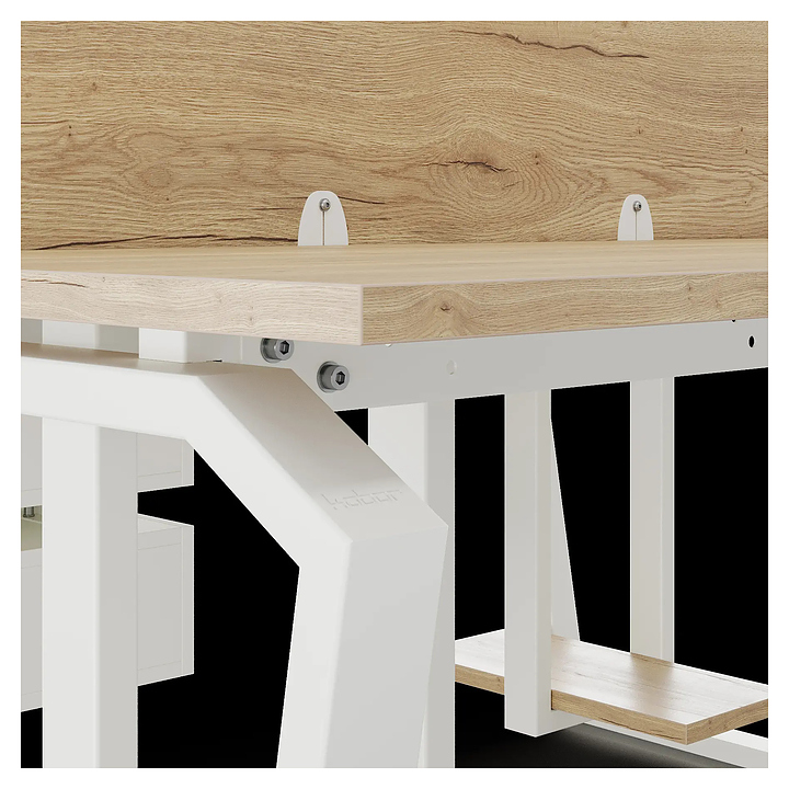 Офисный стол Кобор TB/2-80/120 white/natural на 2 рабочих места используется в офисных помещениях и кабинетах руководителей. Модель оснащена опорами в форме обратной трапеции со скошенными верхними углами. Каркас и опоры выполнены из металла, выкрашенного в цвет белый муар (RAL9016), столешница – из ламинированной древесно-стружечной плиты (ЛДСП) цвета натуральный дуб (H1180 ST37). Дополнительные характеристики:
