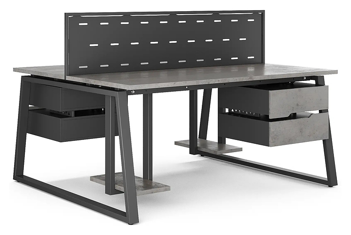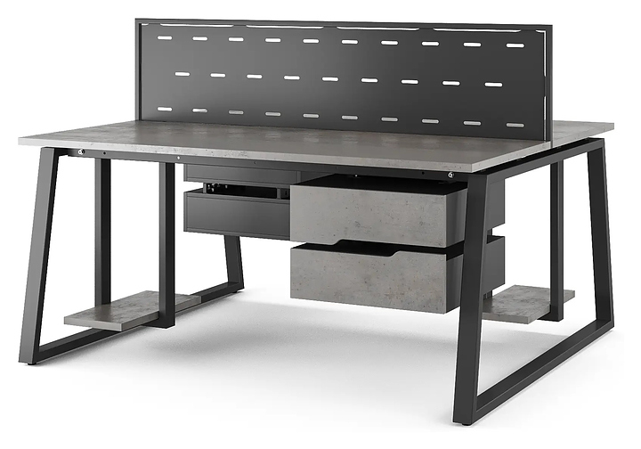 Офисный стол Кобор TR/2-80/160 black/chicago на 2 рабочих места используется в офисных помещениях и кабинетах руководителей. Модель оснащена опорами в форме трапеции. Каркас и опоры выполнены из металла, выкрашенного в цвет черный муар (RAL9005), столешница – из ламинированной древесно-стружечной плиты (ЛДСП) цвета бетон чикаго (F186 ST9). Дополнительные характеристики: