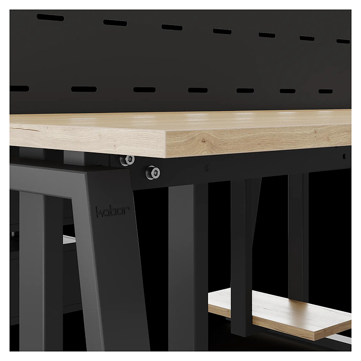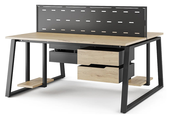 Офисный стол Кобор TR/2-100/120 black/natural на 2 рабочих места используется в офисных помещениях и кабинетах руководителей. Модель оснащена опорами в форме трапеции. Каркас и опоры выполнены из металла, выкрашенного в цвет черный муар (RAL9005), столешница – из ламинированной древесно-стружечной плиты (ЛДСП) цвета натуральный дуб (H1180 ST37). Дополнительные характеристики: