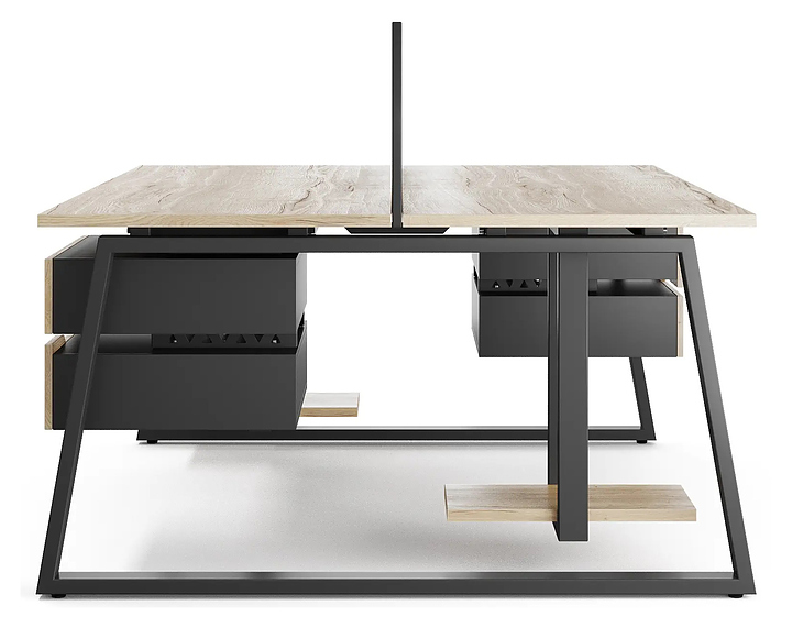 Офисный стол Кобор TR/2-80/140 black/natural на 2 рабочих места используется в офисных помещениях и кабинетах руководителей. Модель оснащена опорами в форме трапеции. Каркас и опоры выполнены из металла, выкрашенного в цвет черный муар (RAL9005), столешница – из ламинированной древесно-стружечной плиты (ЛДСП) цвета натуральный дуб (H1180 ST37). Дополнительные характеристики: