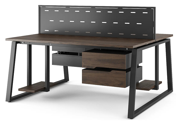 Офисный стол Кобор TR/2-80/140 black/charlston на 2 рабочих места используется в офисных помещениях и кабинетах руководителей. Модель оснащена опорами в форме трапеции. Каркас и опоры выполнены из металла, выкрашенного в цвет черный муар (RAL9005), столешница – из ламинированной древесно-стружечной плиты (ЛДСП) цвета дуб чарльстон (H3154 ST36). Дополнительные характеристики: