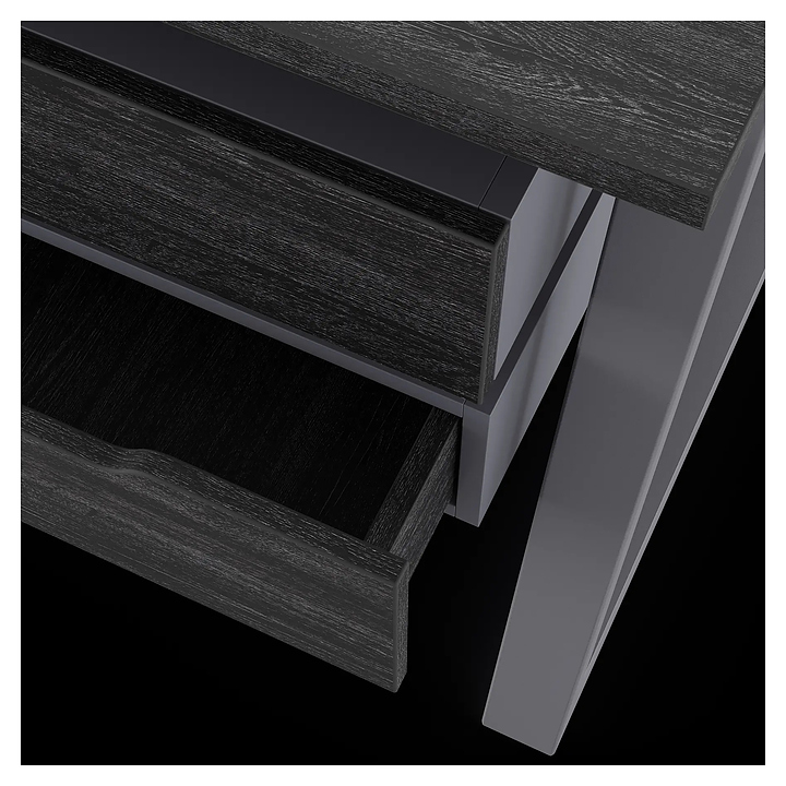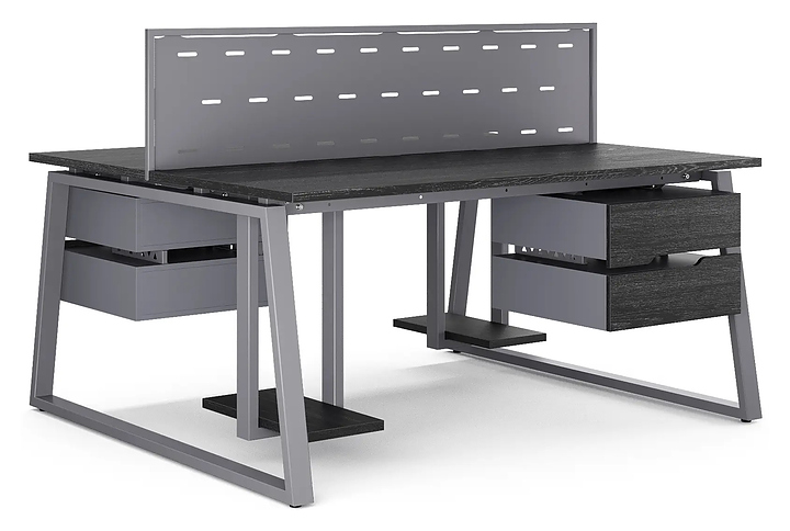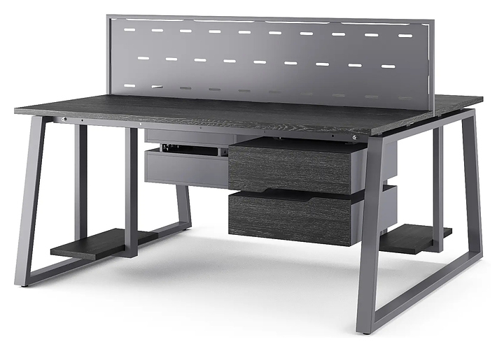 Офисный стол Кобор TR/2-80/120 graphite/glazed на 2 рабочих места используется в офисных помещениях и кабинетах руководителей. Модель оснащена опорами в форме трапеции. Каркас и опоры выполнены из металла, выкрашенного в цвет графит муар (RAL7024), столешница – из ламинированной древесно-стружечной плиты (ЛДСП) цвета черный дуб (H3178 ST37). Дополнительные характеристики: