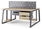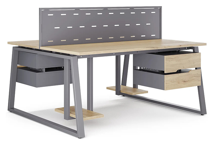 Офисный стол Кобор TR/2-100/120 graphite/natural на 2 рабочих места используется в офисных помещениях и кабинетах руководителей. Модель оснащена опорами в форме трапеции. Каркас и опоры выполнены из металла, выкрашенного в цвет графит муар (RAL7024), столешница – из ламинированной древесно-стружечной плиты (ЛДСП) цвета натуральный дуб (H1180 ST37). Дополнительные характеристики: