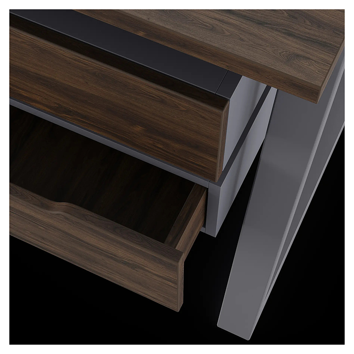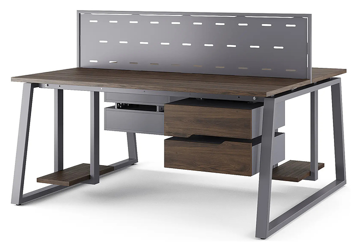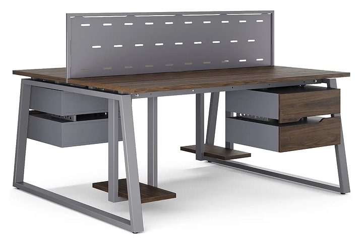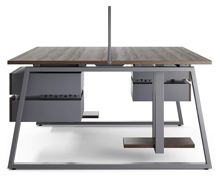 Офисный стол Кобор TR/2-100/120 graphite/charlston на 2 рабочих места используется в офисных помещениях и кабинетах руководителей. Модель оснащена опорами в форме трапеции. Каркас и опоры выполнены из металла, выкрашенного в цвет графит муар (RAL7024), столешница – из ламинированной древесно-стружечной плиты (ЛДСП) цвета дуб чарльстон (H3154 ST36). Дополнительные характеристики: