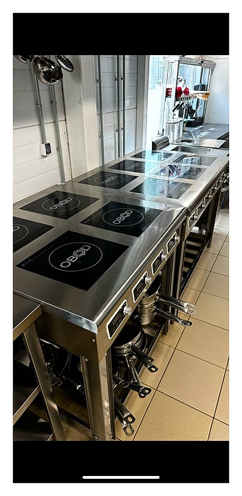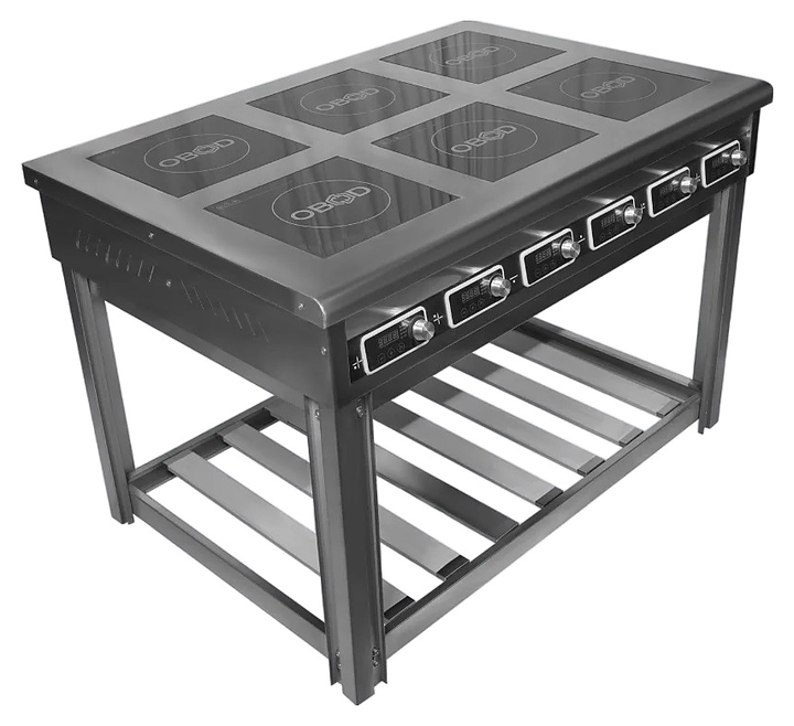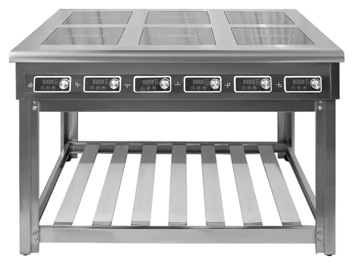 Индукционная плита OBOD ИП-006 предназначена для приготовления большого ассортимента блюд на предприятиях пищевой промышленности, общественного питания и торговли. Принцип работы основан на непосредственном нагреве металлической посуды создаваемыми высокочастотным магнитным полем индуцированными вихревыми токами. Модель оснащена 6 независимыми варочными зонами, открытой подставкой и расположенной на наклонной фронтальной стенке электромеханической панелью управления. Корпус выполнен из нержавеющей стали, рабочая поверхность – из стеклокерамики. Особенности: