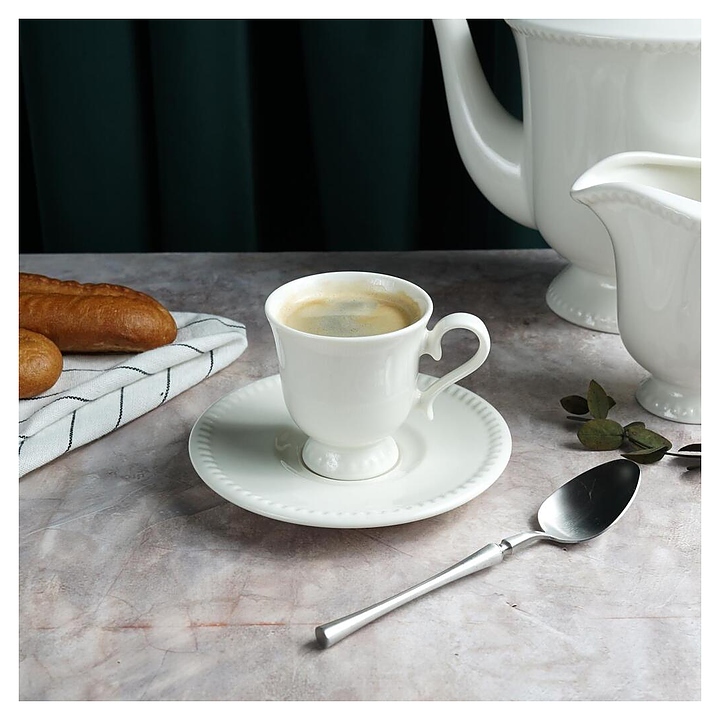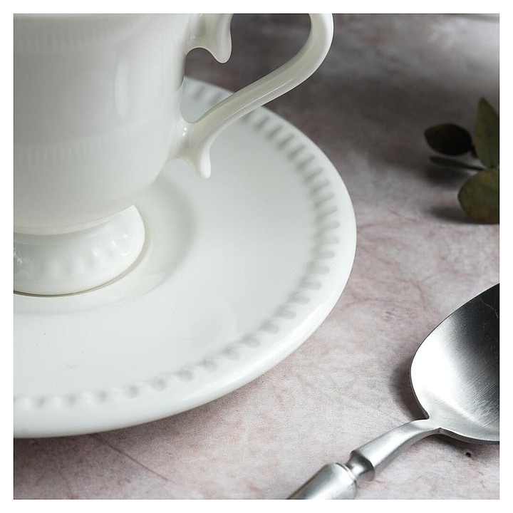 Кофейная пара Noble Luxe 80 мл предназначена для подачи кофе на предприятиях общественного питания и в домашних условиях. Модель состоит из блюдца и чашки круглого сечения. Чашка оснащена плавно расширенным основанием, прямым бортом и дугообразной рукояткой. Изделия выполнены из белого фарфора с декоративным рельефом на внешней поверхности бортов.