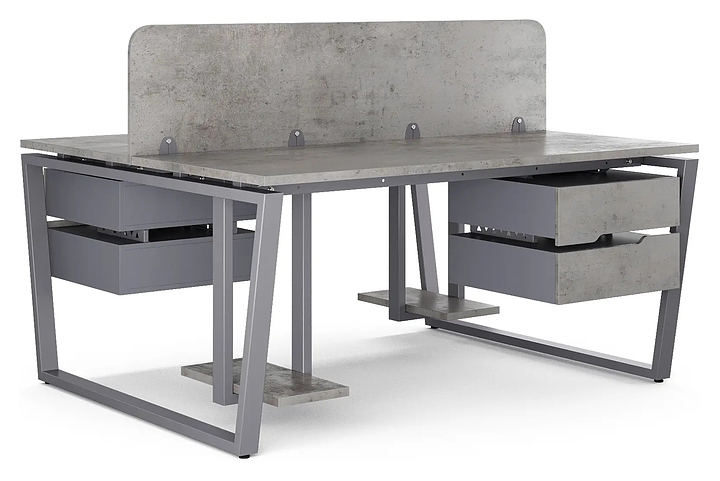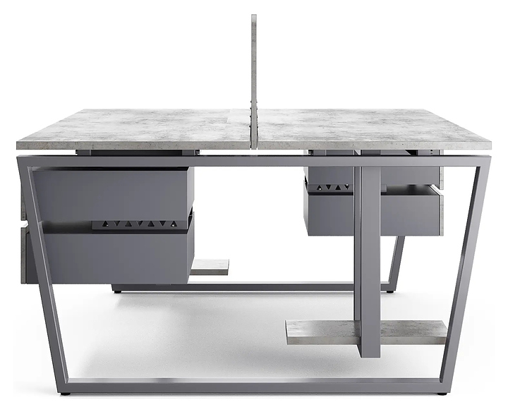 Офисный стол Кобор OTR/2-80/120 graphite/chicago на 2 рабочих места используется в офисных помещениях и кабинетах руководителей. Модель оснащена опорами в форме обратной трапеции. Каркас и опоры выполнены из металла, выкрашенного в цвет графит муар (RAL7024), столешница – из ламинированной древесно-стружечной плиты (ЛДСП) цвета бетон чикаго (F186 ST9). Дополнительные характеристики: