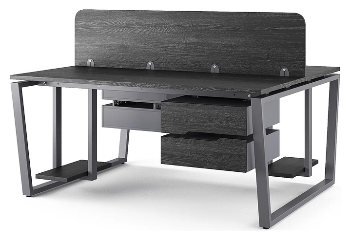 Офисный стол Кобор OTR/2-120/160 graphite/glazed на 2 рабочих места используется в офисных помещениях и кабинетах руководителей. Модель оснащена опорами в форме обратной трапеции. Каркас и опоры выполнены из металла, выкрашенного в цвет графит муар (RAL7024), столешница – из ламинированной древесно-стружечной плиты (ЛДСП) цвета черный дуб (H3178 ST37). Дополнительные характеристики: